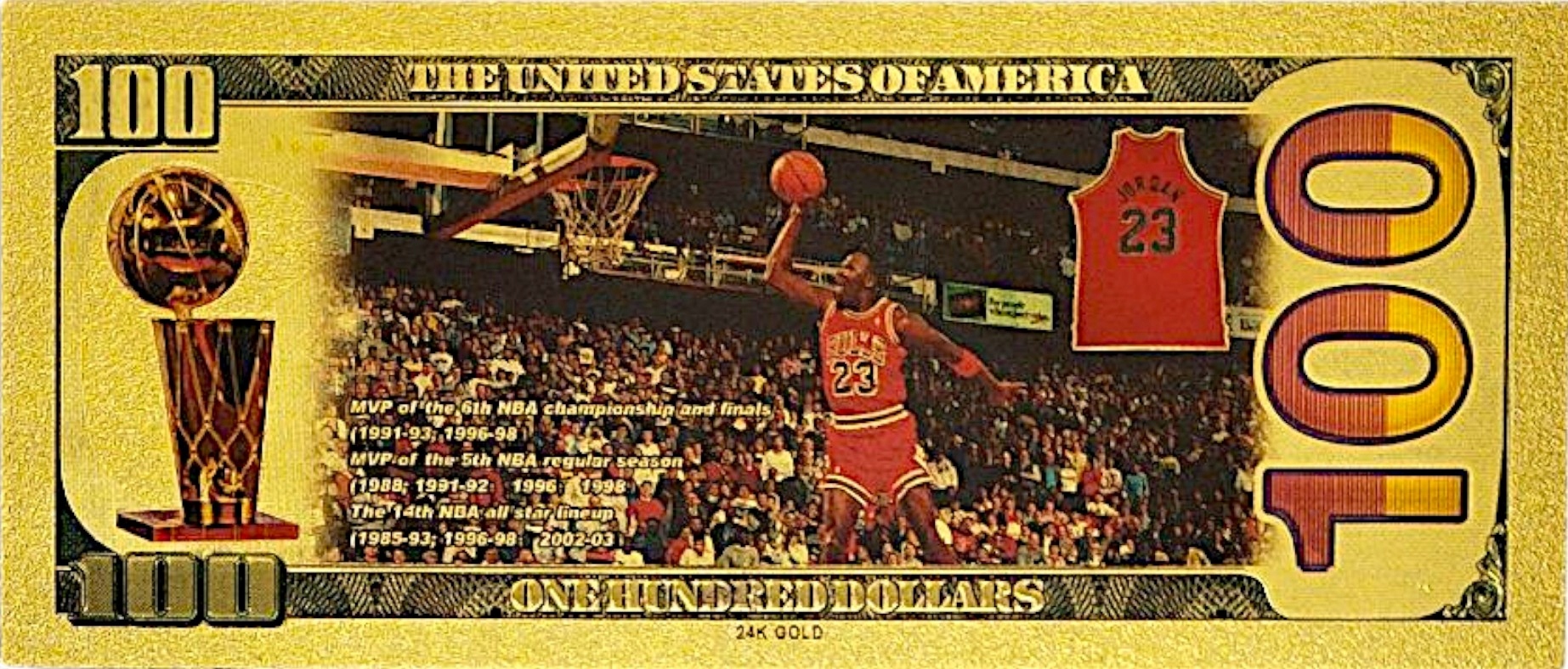 Проявите свое уважение к иконе спорта — Майклу Джордану, шестикратному чемпиону НБА и бесспорному королю баскетбола, который теперь доступен в уникальной коллекционной форме банкноты из ПВХ, покрытой золотой фольгой!