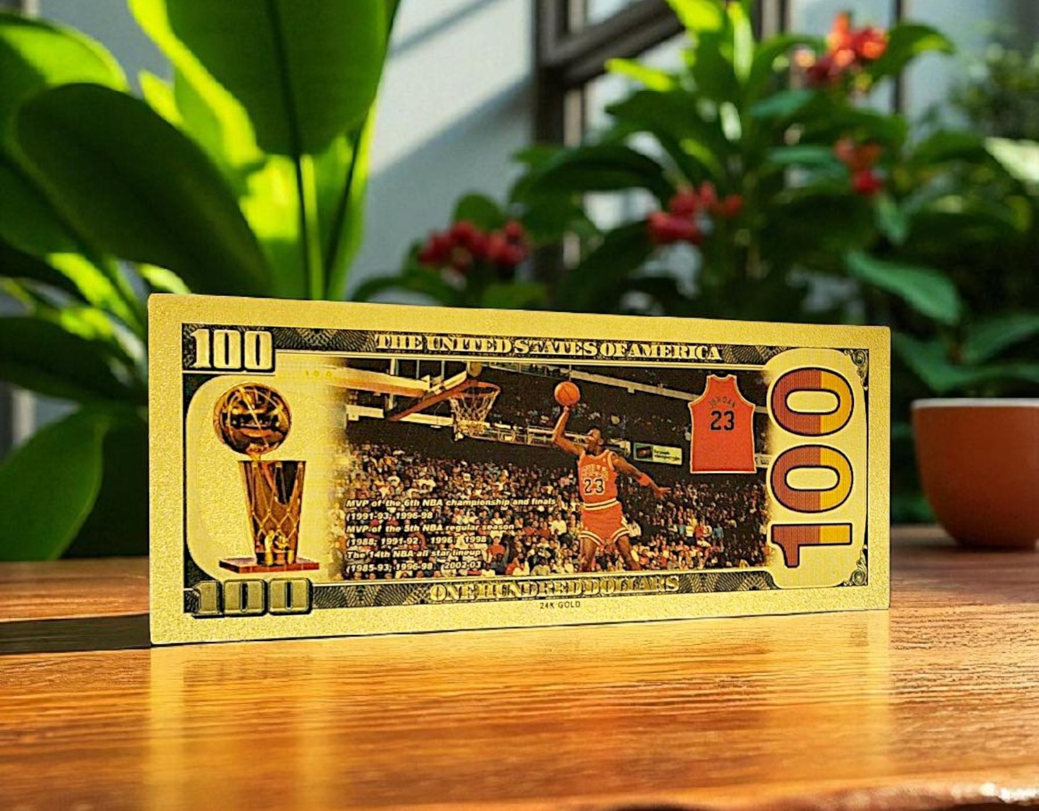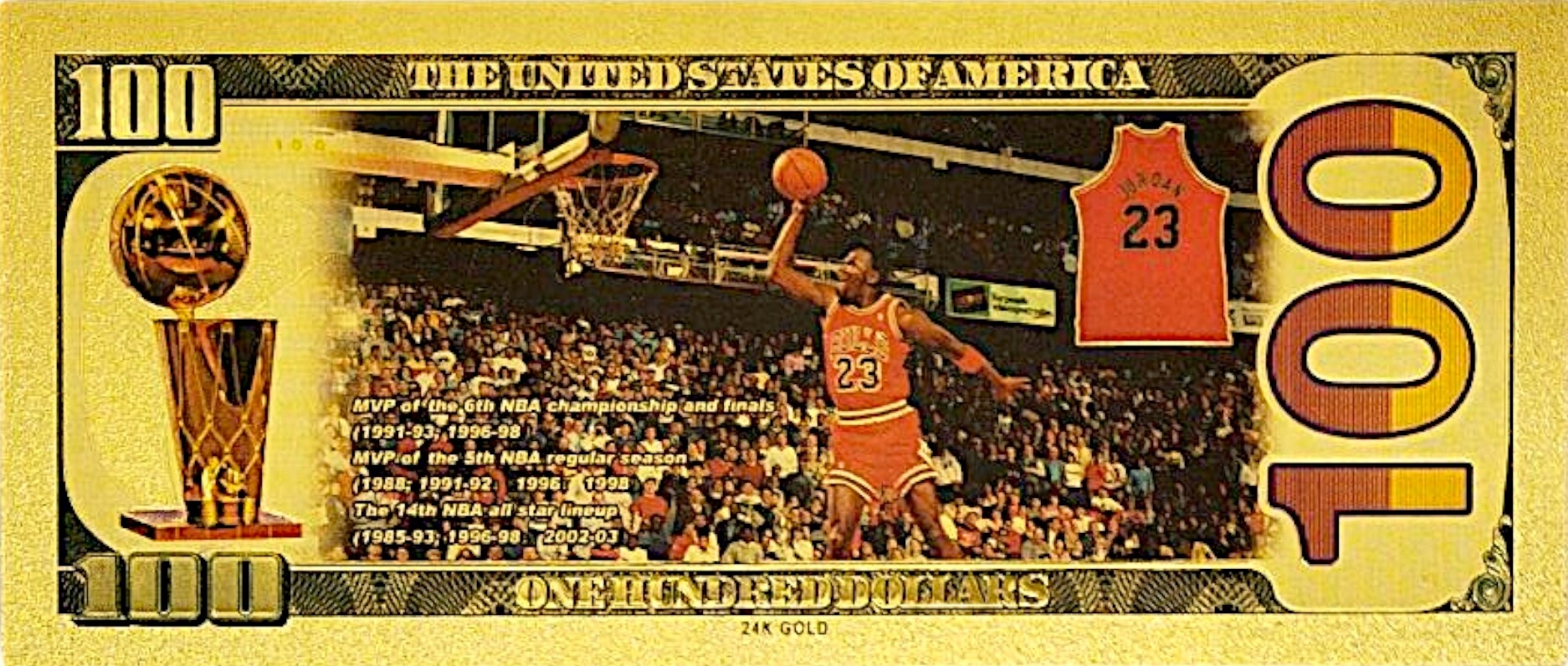 Проявите свое уважение к иконе спорта — Майклу Джордану, шестикратному чемпиону НБА и бесспорному королю баскетбола, который теперь доступен в уникальной коллекционной форме банкноты из ПВХ, покрытой золотой фольгой!
