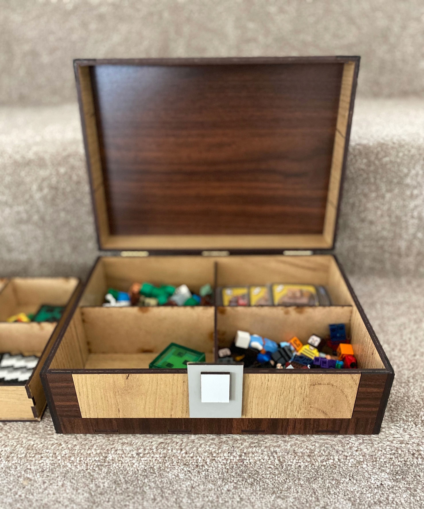 Сундук имеет 4 отделения и дополнительный поднос с шестью отделениями. В шкатулке можно хранить различные сокровища из этого мира, например, LEGO Minecraft, карты UNO Minecraft, некоторые изделия из бисера, статуэтки и т. д.