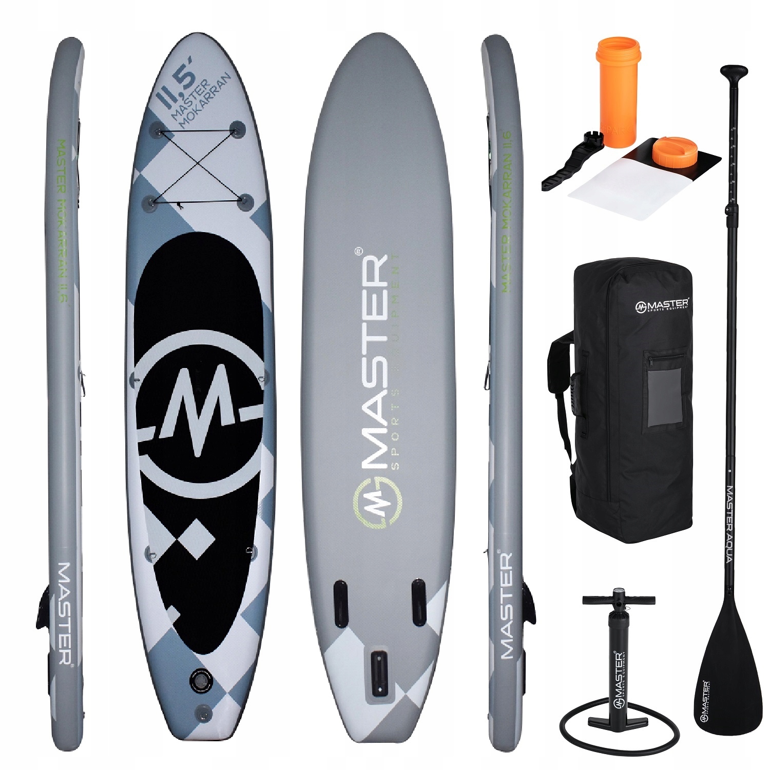Paddleboard Master Aqua Mokarran - 11,5 " предназначен для начинающих и продвинутых пользователей в спокойных водах и на умеренных волнах. Больший размер, и, следовательно, максимально возможная нагрузка 160 кг обеспечивает превосходное веселье в одиночку, а также для родителей. сумка
