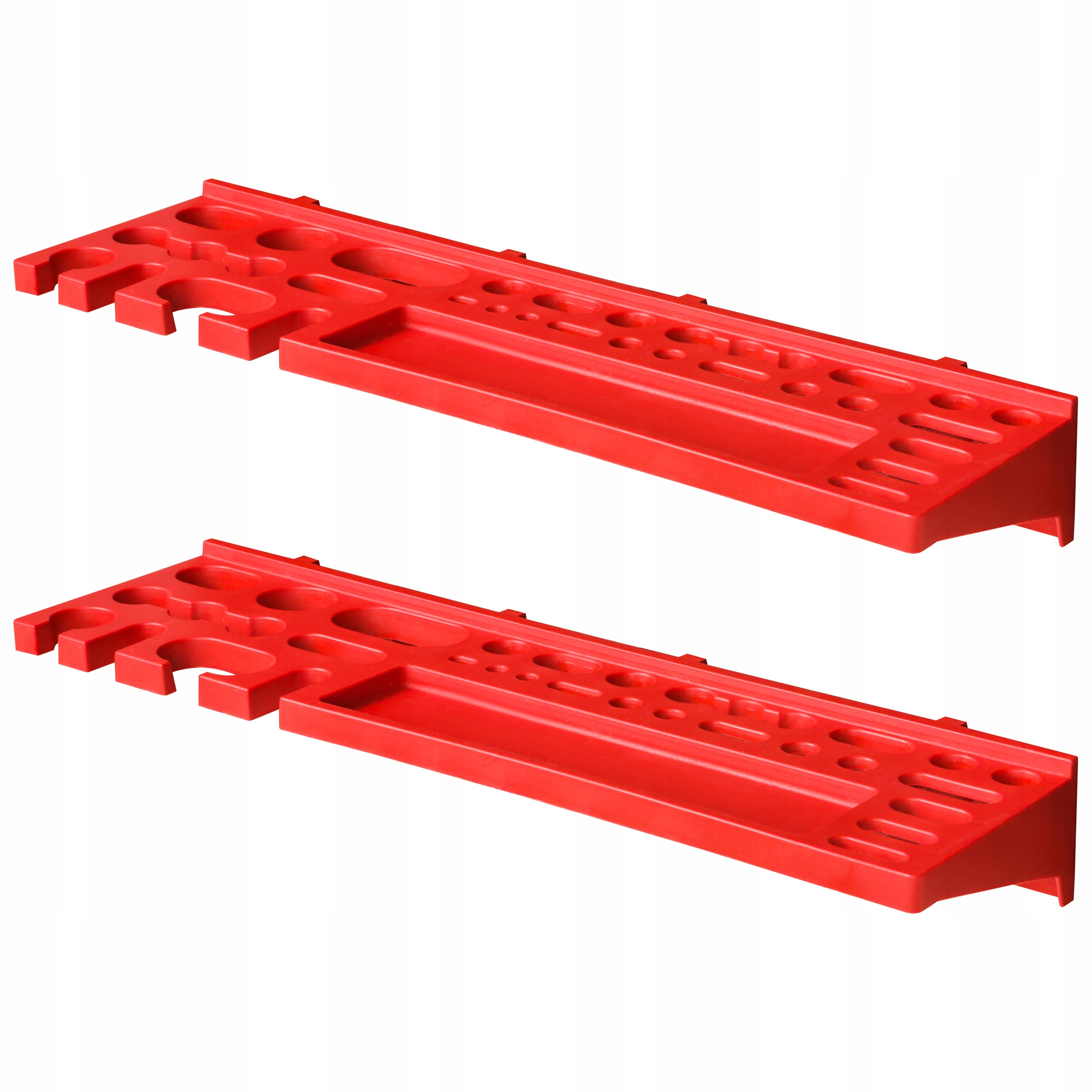 - Наборы держателей: В комплект входят: 2 полки для инструментов 384 x 111 x 50 мм, 4 держателя для ключей (2 вертикальных, 2 горизонтальных), 8 держателей для отверток, мелкий инструмент, 4 вешалки 5,5 см, 4 вешалки 3,5 см, держатель для инструментов с девятью отделениями и десятью вешалками, размеры 597 х 118 мм - черный/красный.
