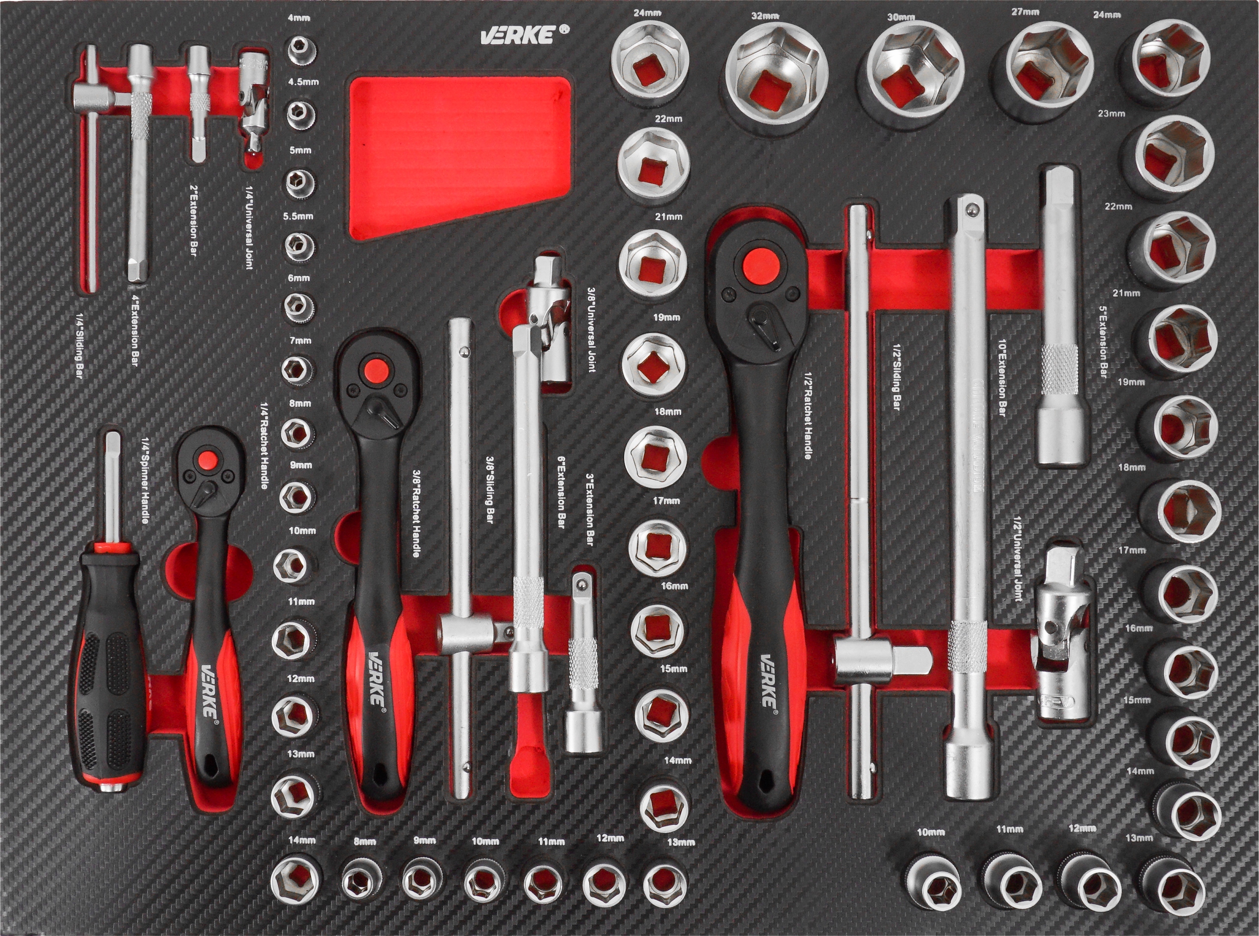 - набор торцевых ключей на 1/2 дюйма: трещотка с 72 зубьями, Т-образная ручка, угловой шарнир, удлинители 5 и 10 дюймов, головки: 10, 11, 12, 13, 14, 15, 16, 17, 18, 19, 21, 22, 23, 24, 27, 30, 32.