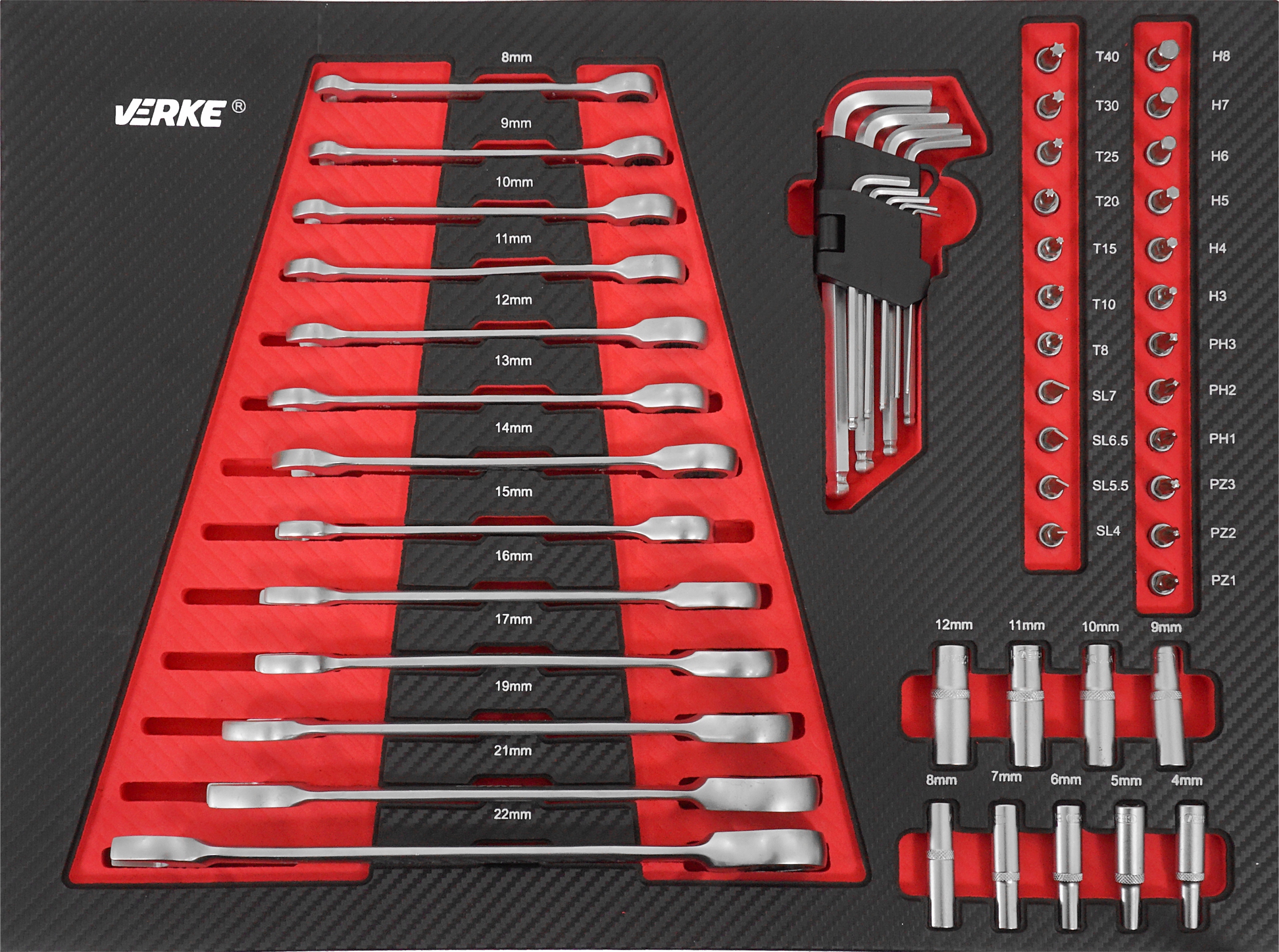 - - 13 комбинированных ключей с храповым механизмом: 8, 9, 10, 11, 12, 13, 14, 15, 16, 17, 19, 21 , 22