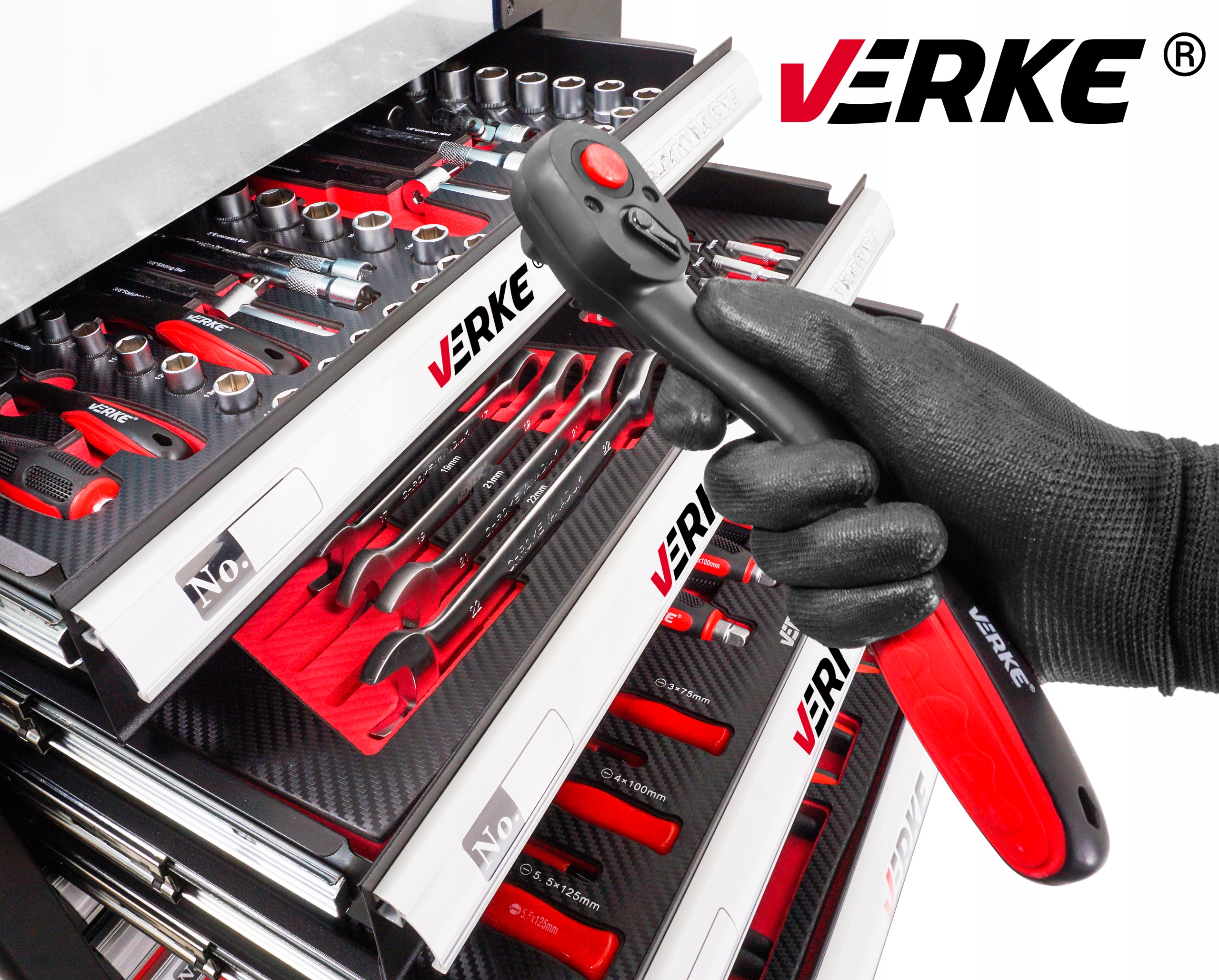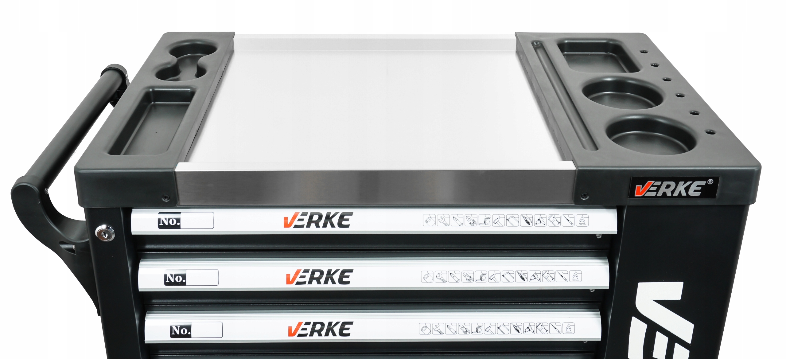 Шкаф для инструментов Верке имеет 7 практичных ящиков для инструментов, закрывающихся на центральный замок. Все ящики полностью открываются и оснащены шариковыми направляющими, что обеспечивает длительную, плавную и надежную работу. Ящики фиксируются замком с храповым механизмом, который обеспечивает защиту окружающей среды во время транспортировки. Поверхность столешницы стойка к маслам и жирам. Пятидюймовые, бесшумные, поворотные колеса облегчают маневрирование шкафа, а также оснащены тормозом. Шкаф оснащен ручкой, облегчающей переноску.