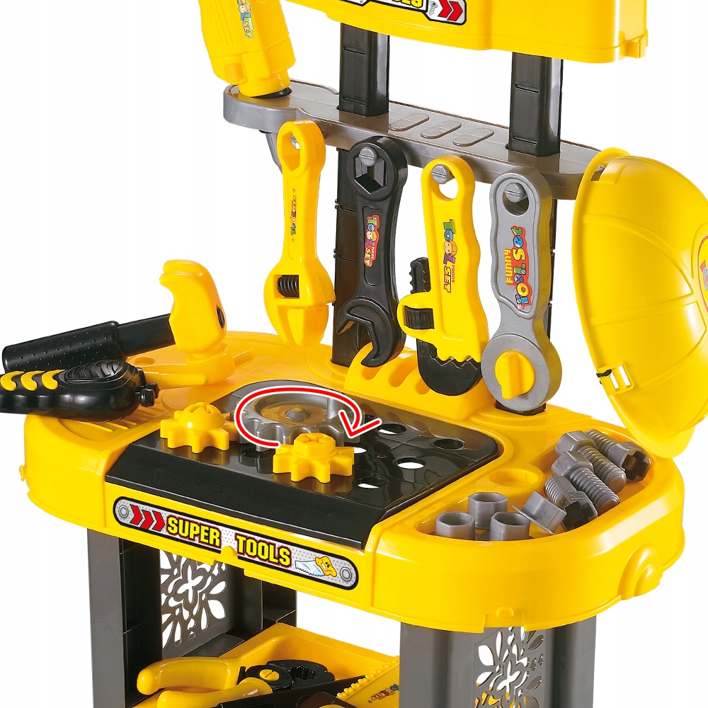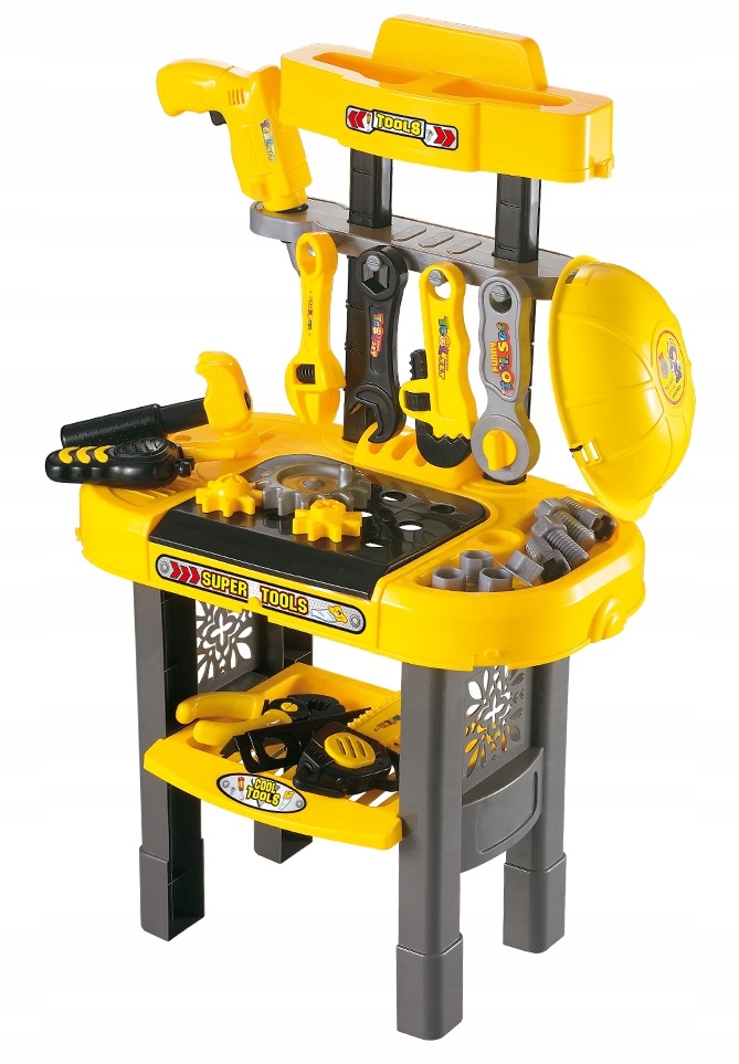 Наши уникальные инструменты для детской мастерской включают верстак винты, гайки, шлем, дрель, комбинированные плоскогубцы, 2 гаечных ключа, мини-пилу, угольник.