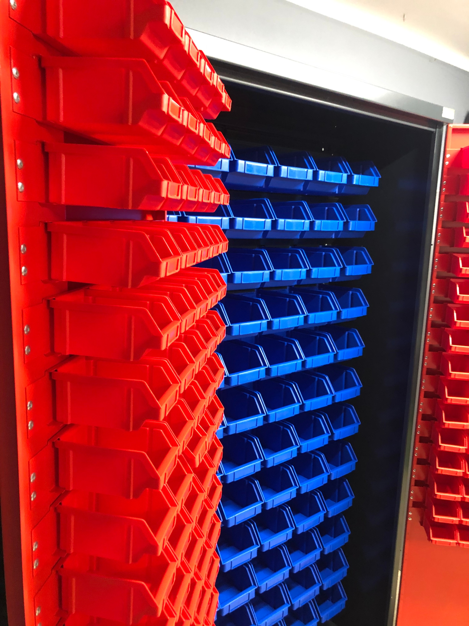 Все элементы гардероба изготовлены из стального листа толщиной 1,0 мм. Двери со скрытыми петлями. Дверная ручка с предохранителем с двухточечным запиранием. Шкаф оснащен планками для крепления инструментальных контейнеров размерами 108 х 144 х 224/170 мм (72 шт.) на задней стенке и размерами 56 х 77 х 119/90 мм (по 80 шт.) на дверце шкафа. Шкаф поставляется в контейнерах.