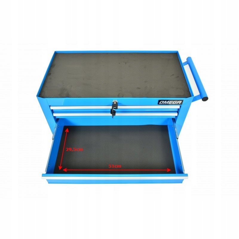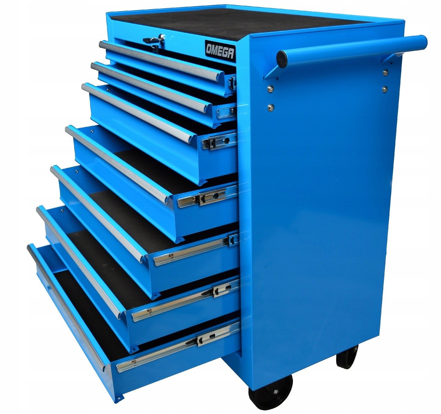 Тележка для инструментов с семью ящиками без оборудования. Компактный дизайн делает его особенно рекомендуемым для автосервисов или гаражей. Стальная конструкция, верхняя часть покрыта резиной.