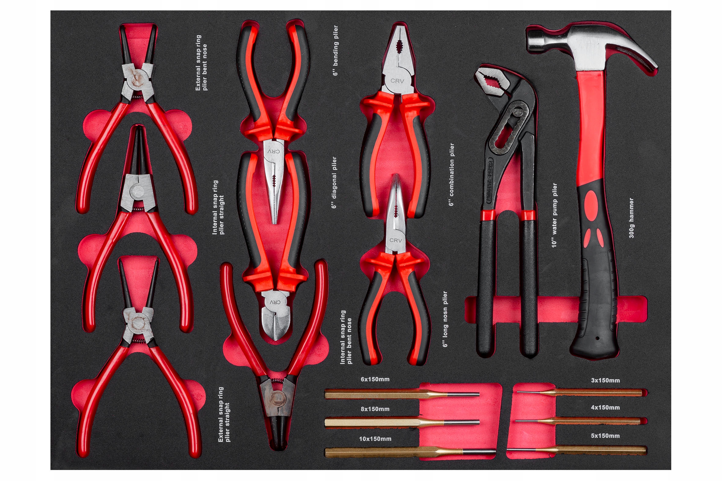 Инструменты, входящие в состав тележки, представляют собой 243 элемента, изготовленных из хромванадиевой стали (CrV), обладающей высокой устойчивостью к износу и деформации. Трещотки оснащены системой Quick Release и храповым механизмом на 72 зубца.