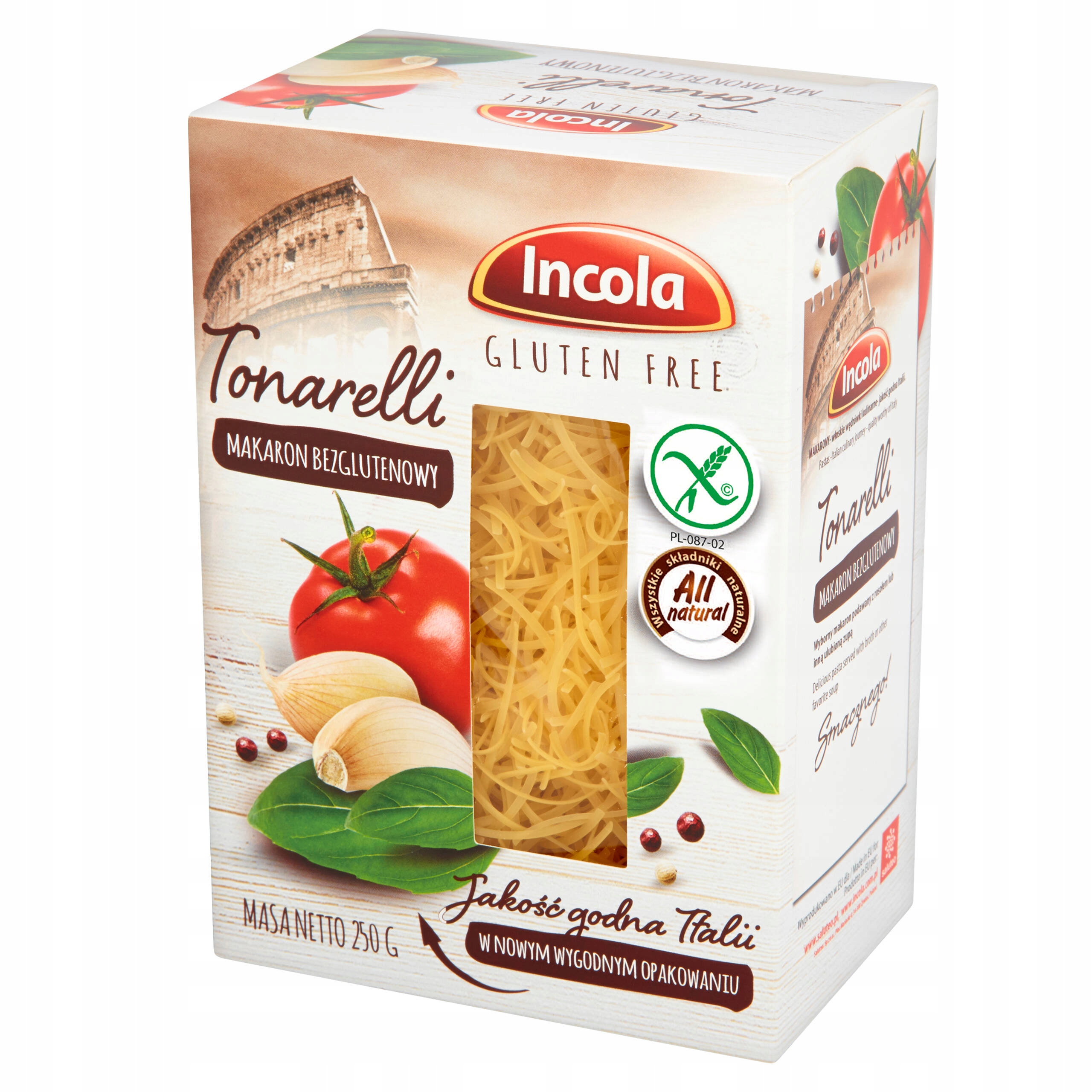 Вся продукция Incola сертифицирована Польской ассоциацией людей с целиакией и безглютеновой диетой. Безглютеновая паста Тонателли — это вкусная паста, которую подают с бульоном или другим любимым супом. Макаронные изделия состоят преимущественно из кукурузной муки, которая является источником витаминов В1, В6, фолиевой кислоты, железа, магния и цинка. Цинк поддерживает иммунитет.