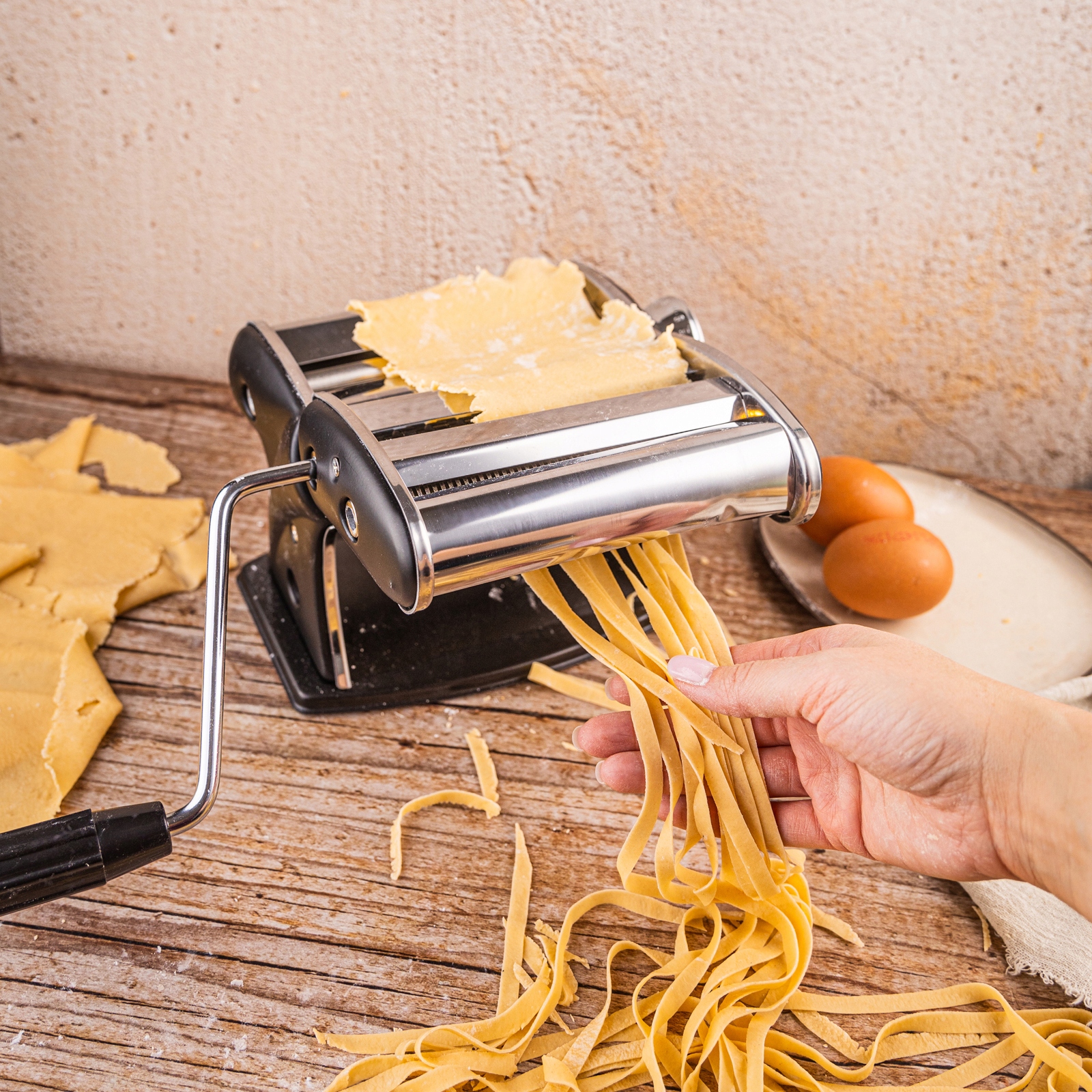 Прибор не только раскатывает тесто в идеально ровный лист, но и режет его – благодаря входящим в комплект матрицам можно делать классические тонкие нити, более широкие ленты или полоски для лазаньи. Все свежее, упругое и без консервантов.