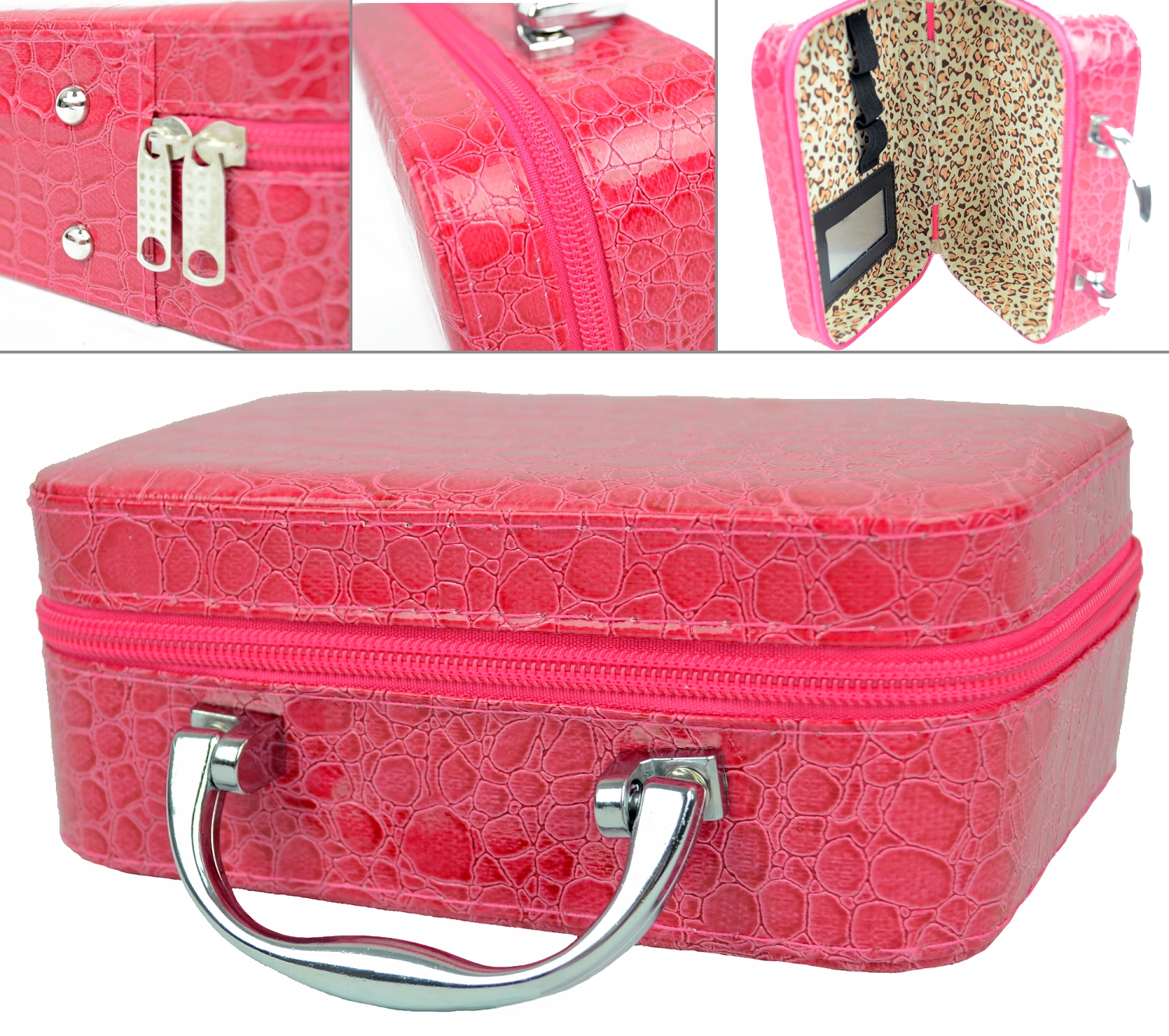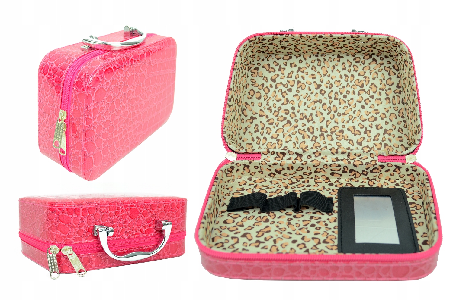Все упаковано в красивую коробку из искусственной кожи ярко-розового цвета. У нее удобная ручка, поэтому ее можно использовать и как стильную сумочку. Он имеет четыре ножки, прикрепленные снизу, и открывается с помощью молнии. Внутри — нежная подкладка из ткани в крапинку. К одной половине футляра прикреплены три резиновые ленты для стабилизации выбранной косметики и зеркало, в которое вы можете смотреть на себя. Все сделано предельно тщательно и выглядит очень профессионально.