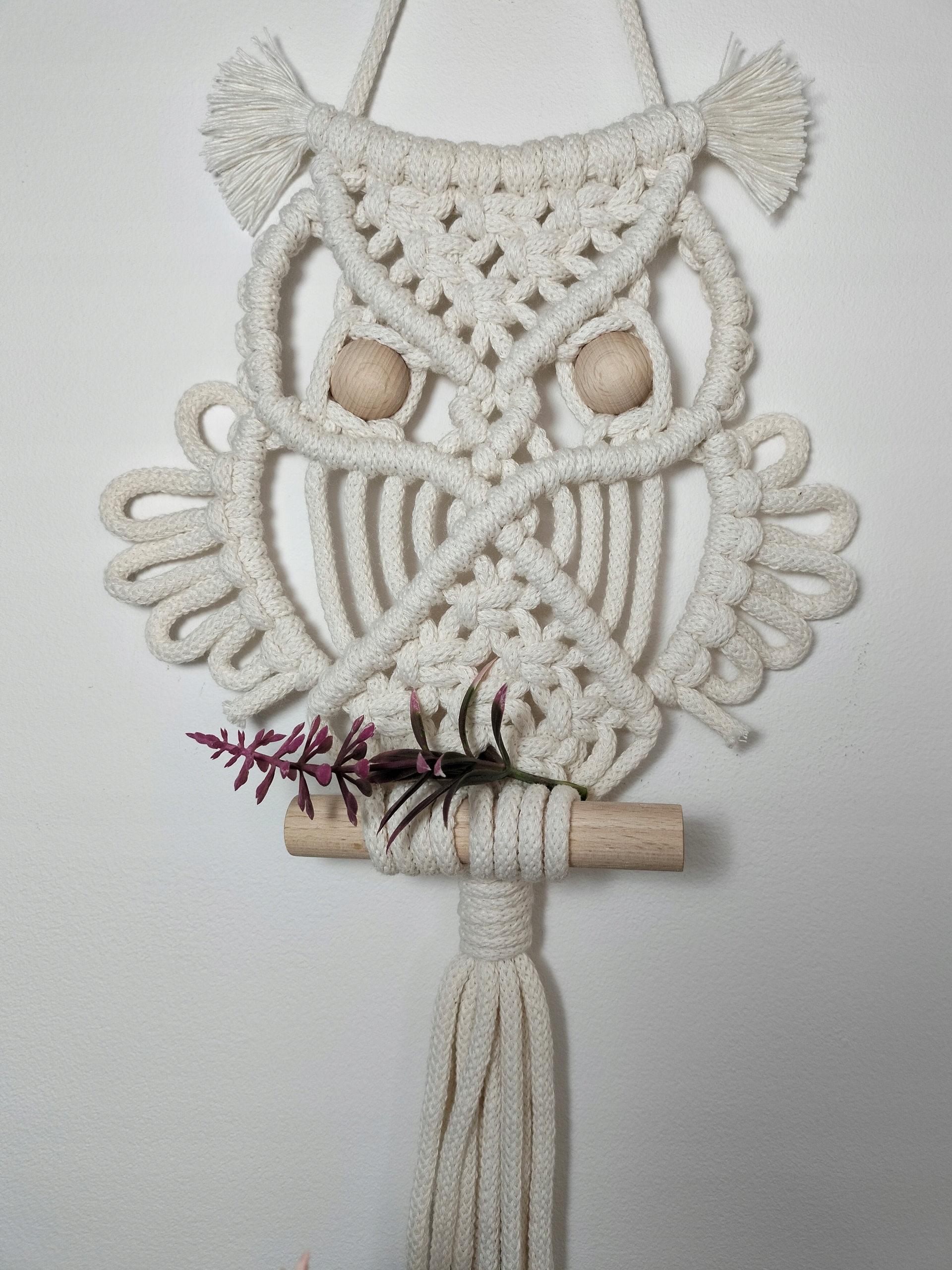 Макраме СОВА на стіну на шнурку 50 см екрю бохо