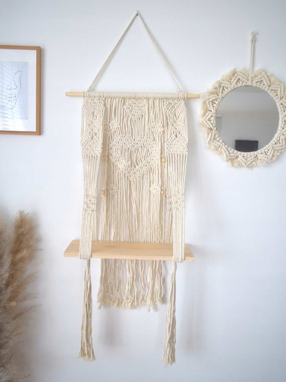 СЮЖЕТНОЕ МАКРАМЕ С ПОДВЕСНОЙ ДЕРЕВЯННОЙ ПОЛКОЙ В БОХО