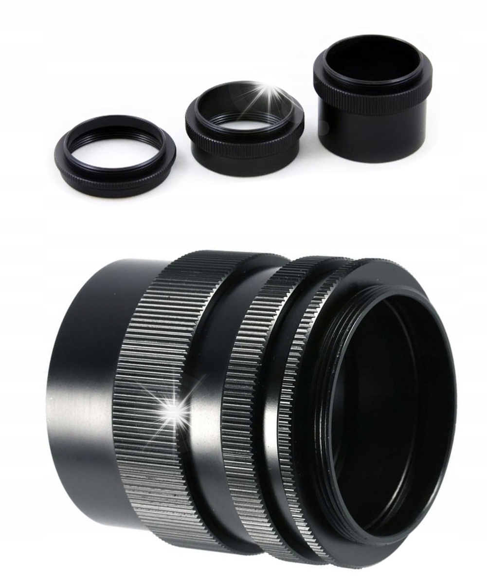 В комплект входят три кольца длиной: 7, 14 и 28 мм (можно можно совместить), самое маленькое и самое большое имеют встроенные резьбы: одно для крепления колец к корпусу, другое для крепления объектива к кольцам.
