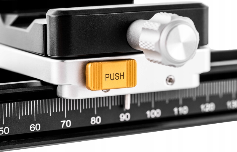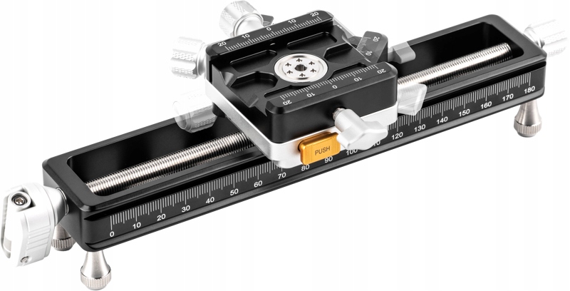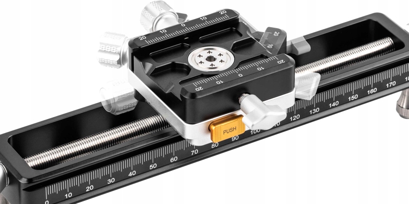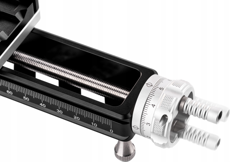 Макровая рельс может быть установлен на большинстве суппортов Arca Ball/Ball Heads, доступных на рынке, а также содержит четыре съемных молотка, которые позволяют использовать рельс непосредственно на столешнице. Для вращения составляет 1 мм с гравированными индексными маркерами по обе стороны рельса для точной регулировки.