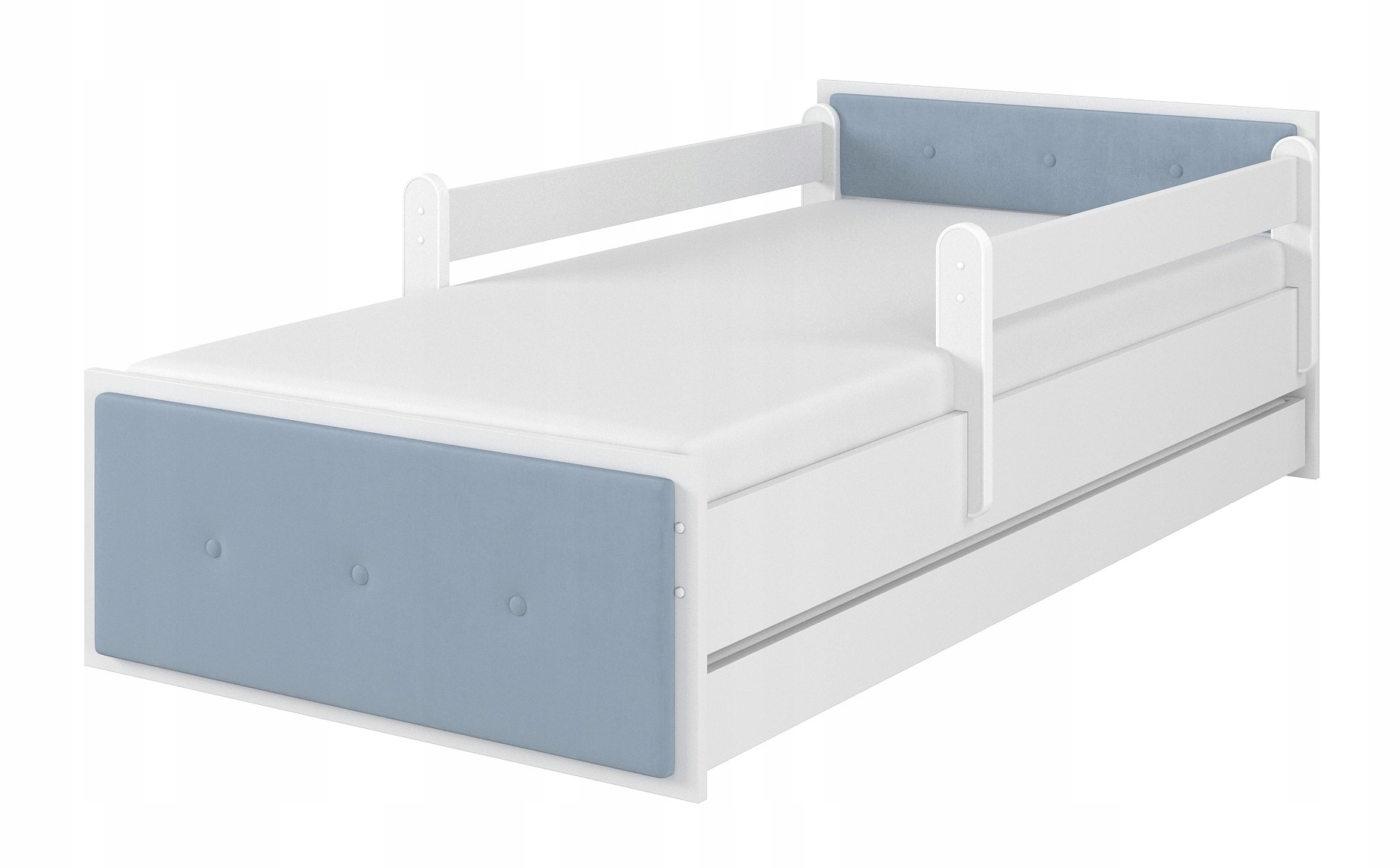 В комплект входит практичная Ящик выдвигается под кровать на колесиках – это значит, что его можно выдвигать вправо и влево. В нем можно хранить постельное белье и любимые игрушки ваших детей. В комплект также входят две защитные поручни, защищающие ребенка от падения, длиной 100 см. Они раскладываются по бокам кровати, а это значит, что вам решать, куда их поставить.