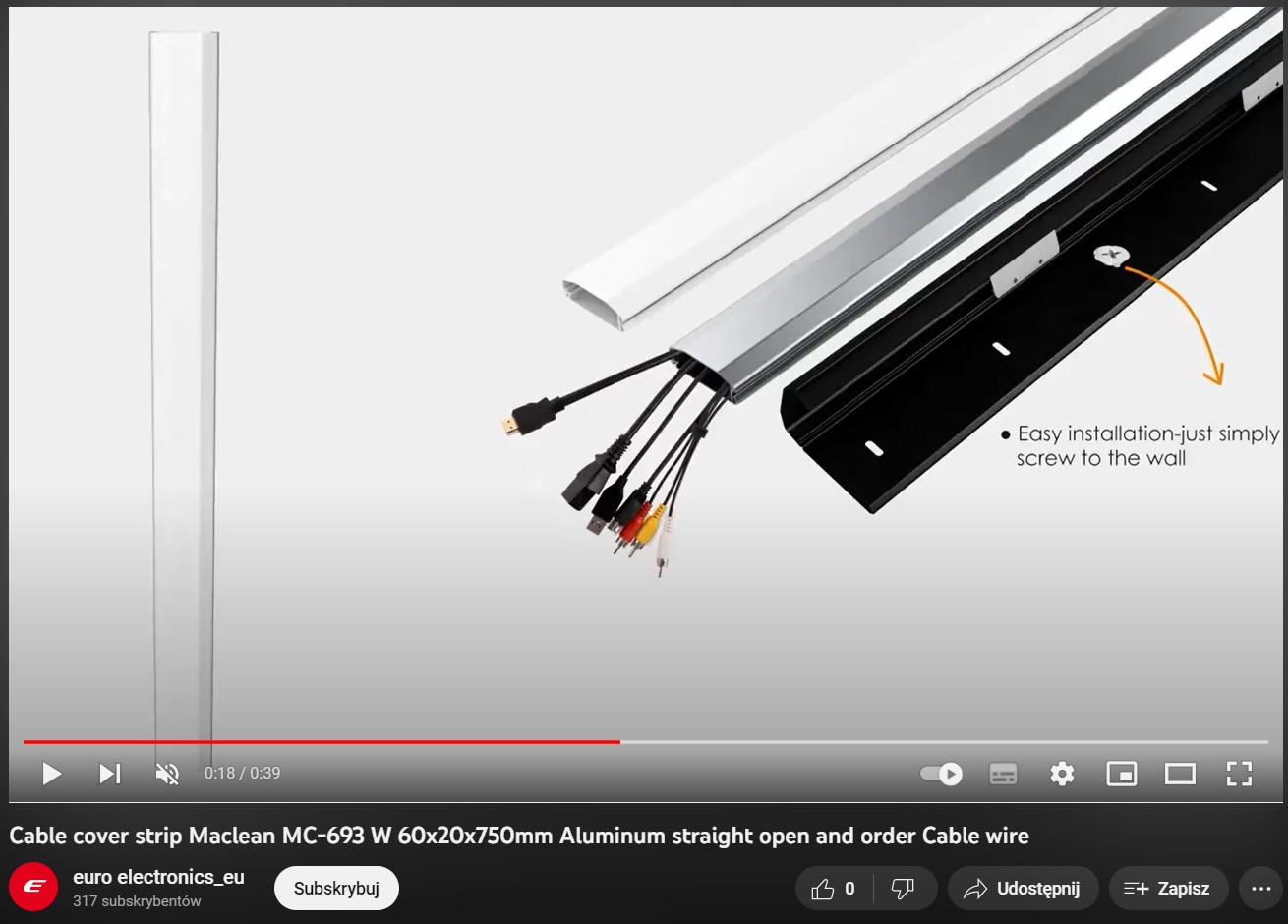 Высококачественная алюминиевая накладка. Он позволяет элегантно и незаметно прокладывать и скрывать кабели, соединяющие оборудование RTV/SAT. Низкий профиль ленты делает ее менее заметной.