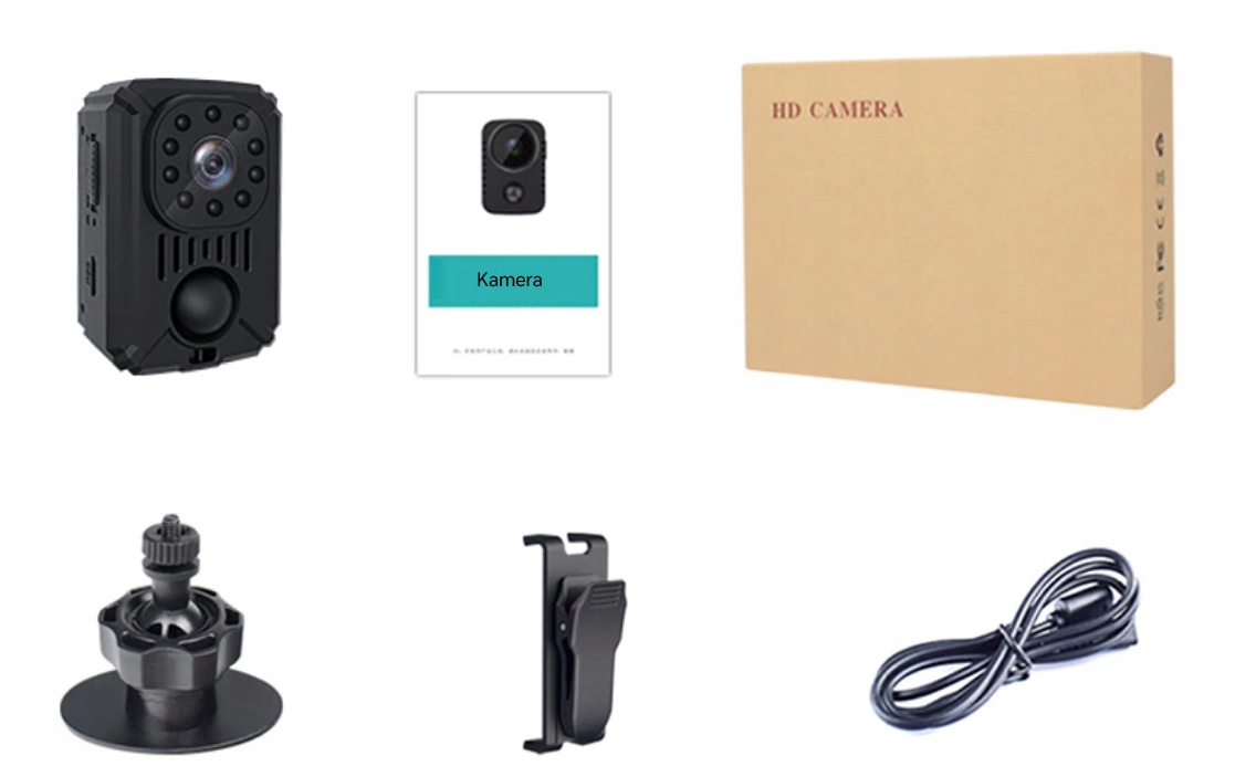 Благодаря ручкам в комплекте мы можем установить устройство в любом запланированном месте и расположить его под любым углом. Входящий в комплект зажим позволяет прикрепить камеру к одежде.