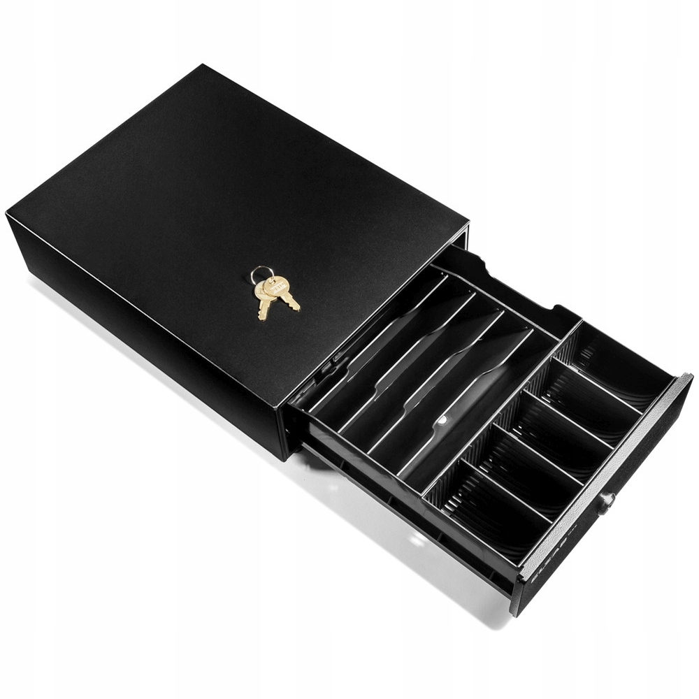 Надежный ящик в металлическом корпусе. Оснащен разъемом RJ для подключения кабеля выдвижного ящика. В состав ящика входит кабель, соединяющий кассовый аппарат с разъемом RJ.