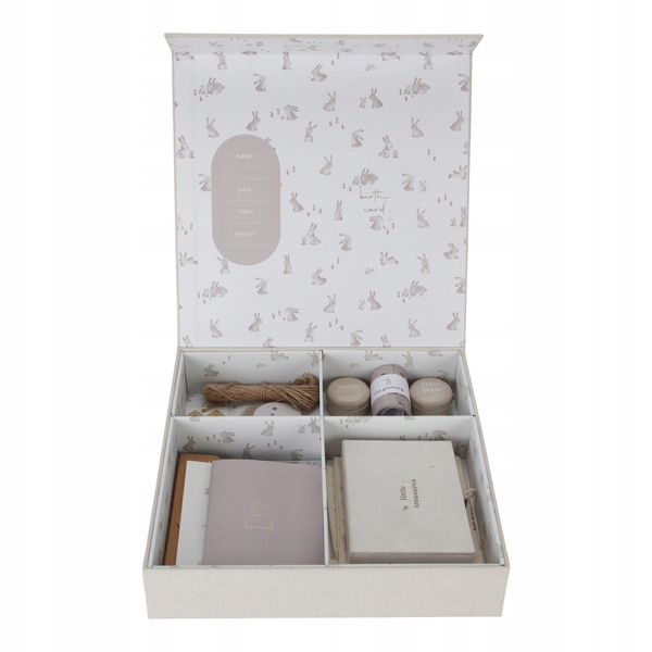 коробка памяти Baby Bunny FSC из Little Litg - это необычная коробка, которая может сопровождать любого родителя с момента рождения ребенка. Коробка памяти - это своего рода дневник. В коробке мы найдем много элементов, которые позволят вам сохранить важные моменты детства в памяти. В коробке содержится буклет, теги, джутовая струна, конверты, лист наклеек, жестяный угол блокировки волос, оловянная коробка для первого зуба, коробку для хранения маленьких сокровищ, измерение ленты, кошелек для хранения первых срокетов и пакет для хранения пруда. Весь набор упакован в красивую бежевую коробку с мотивом из коллекции Baby Bunny. Отличная идея для подарка для будущей матери по случаю детского душа.