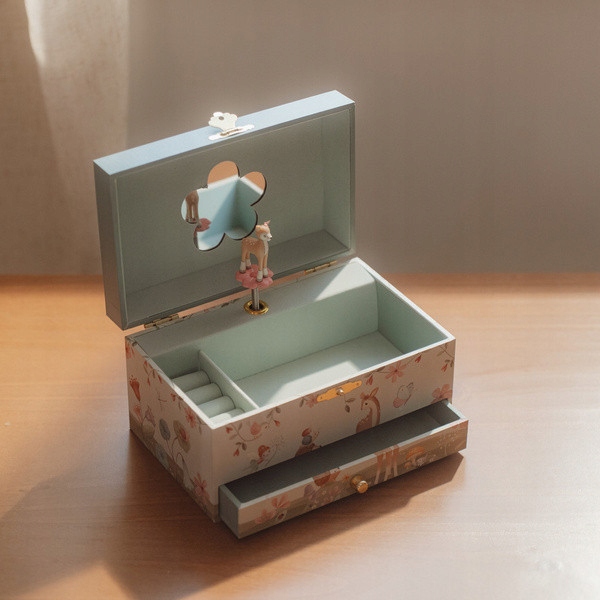 Шкатулка с музыкальной шкатулкой - Олень от Little Dutch. Заведя музыкальную шкатулку и открыв эту красивую шкатулку, Олень начнет танцевать перед зеркалом под ритм приятной музыки. Шкатулка идеально подходит для хранения детских сокровищ и украшений. А также станет прекрасным украшением детской комнаты. Отличная идея для подарка. В коробке нет украшений.
