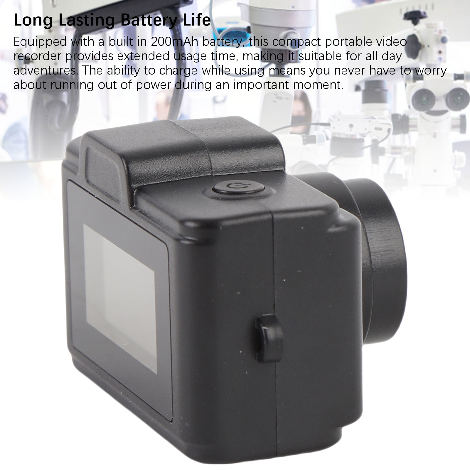 3. Аккумулятор с длительным сроком службы. Этот компактный портативный видеорегистратор, оснащенный встроенным аккумулятором емкостью 200 мАч, обеспечивает более продолжительное время работы, что делает его пригодным для приключений на целый день. Возможность подзарядки во время использования означает, что вам никогда не придется беспокоиться о том, что в важный момент закончится заряд.