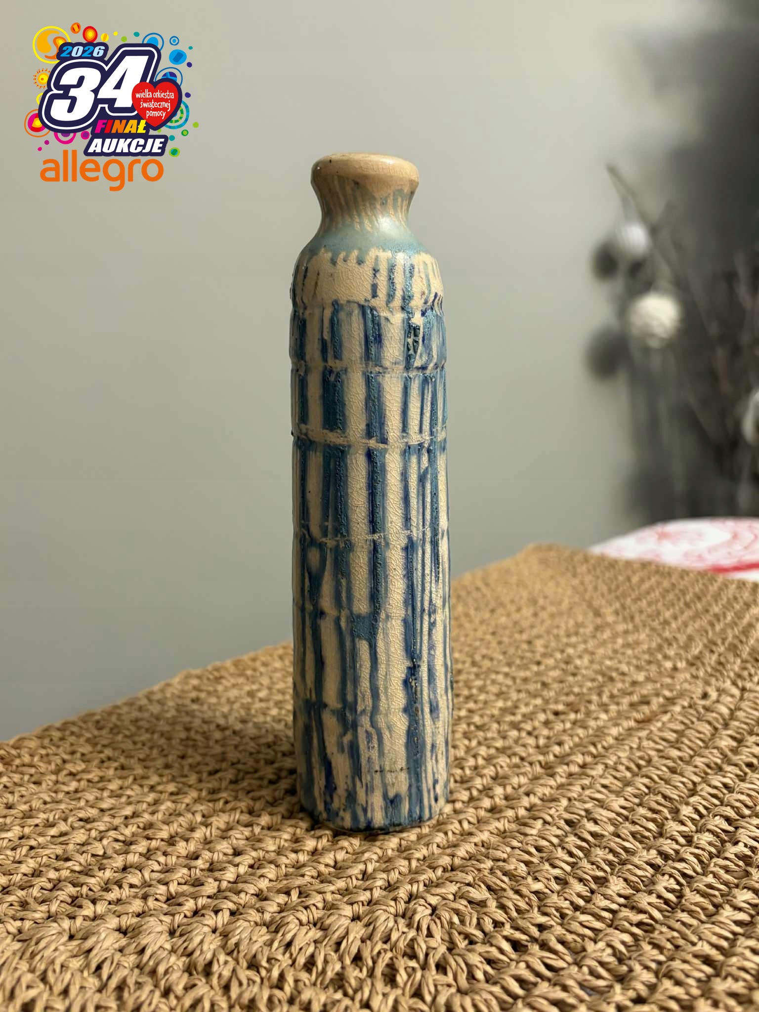 Небольшая керамическая ваза, доминирующие цвета бежевый и синий.