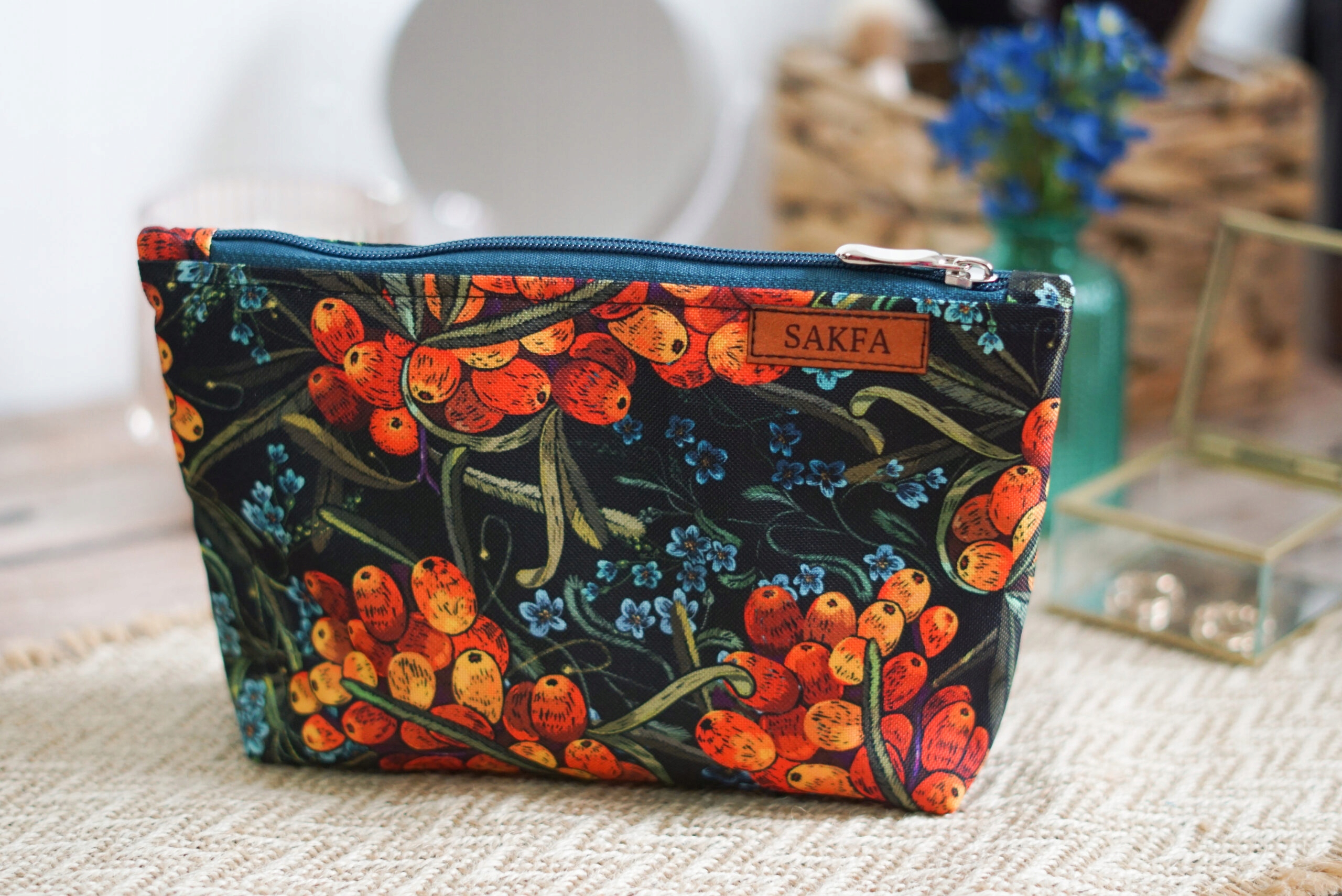 Проектирование и исполнение Его уникальный узор сочетает в себе нотки лесной облепихи с романтическим очарованием синих цветов, создавая чрезвычайно красивую композицию. Помимо своей практической функции, косметичка станет прекрасным украшением вашего туалетного столика.