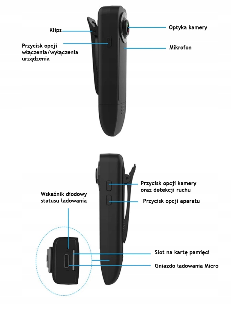 Благодаря встроенному держателю/клипсе мы сможем установить устройство в любом запланированном месте, а также позволит прикрепить камеру к одежде.