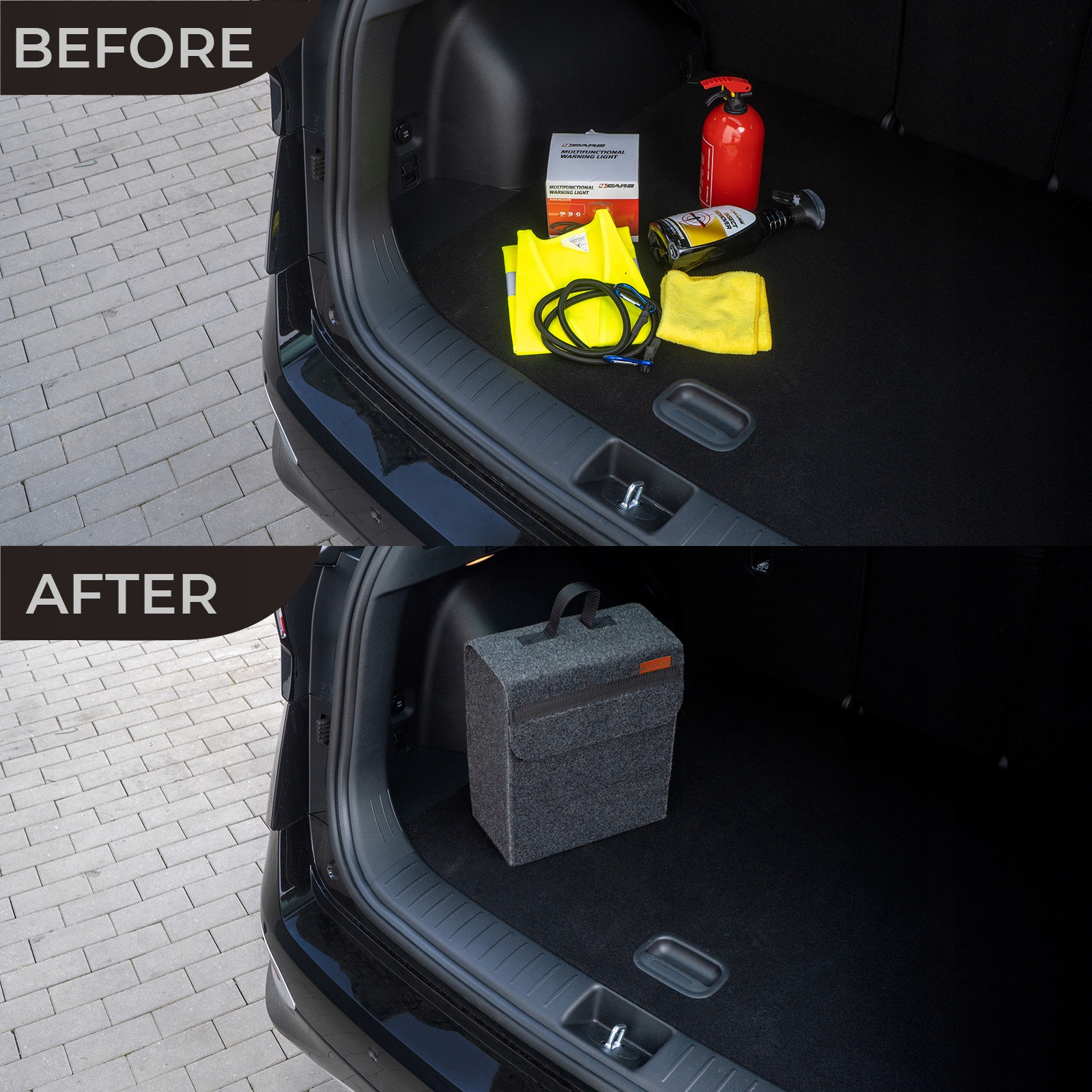 Органайзер, который можно установить в багажник. Помогает содержать ваш автомобиль в порядке. Подходит для автомобильных аксессуаров, таких как масло и жидкость для омывателя ветрового стекла. Легкая сборка. Легко поддерживать чистоту. Очень эстетичный внешний вид. Приятный на ощупь.