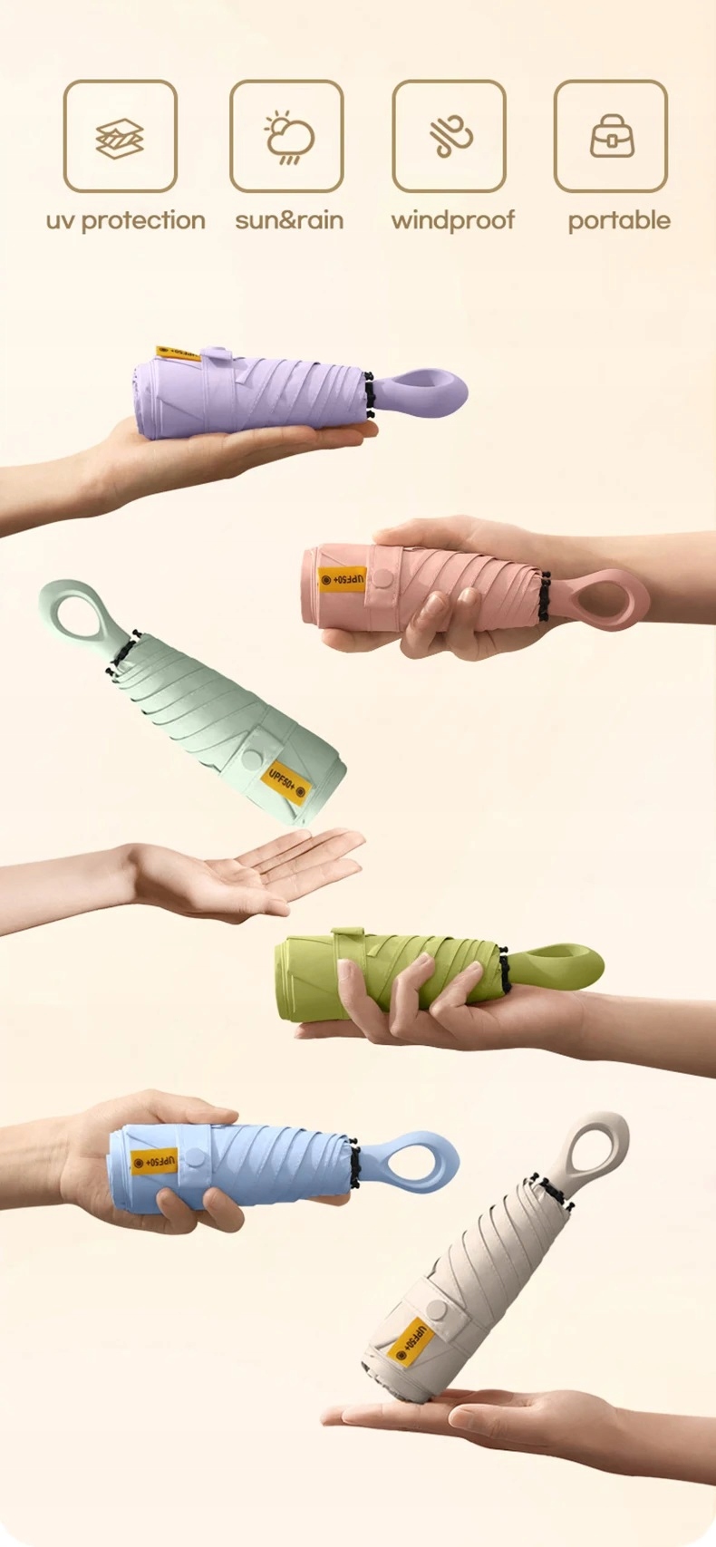✅ пластиковая ручка. Удобная крышка была прикреплена к зонтике. Благодаря высокопоставлению UPF 50+, он блокирует 99,9% вредных лучей UVA и UVB от солнца, защищая вашу кожу от повреждения солнца.