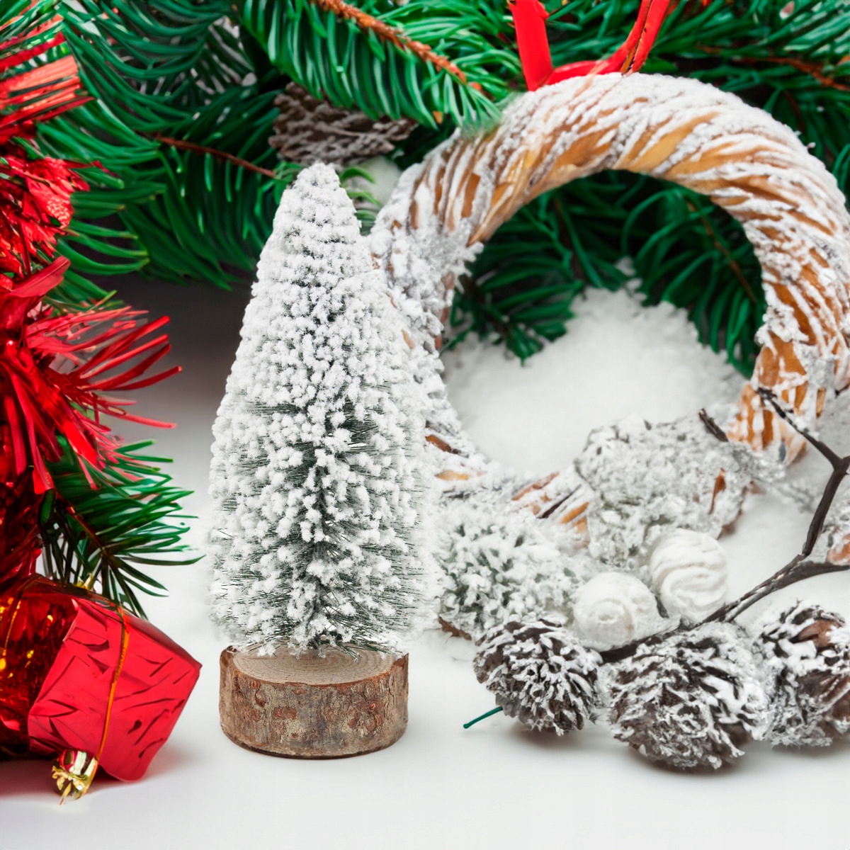 МАЛЕНЬКА ЯЛИНКА НА СТОВОРІ, ОБТАПАНА ШТУЧНИМ СНІГОМ ДЕКОР ФІГУРКИ ЯЛИНКИ