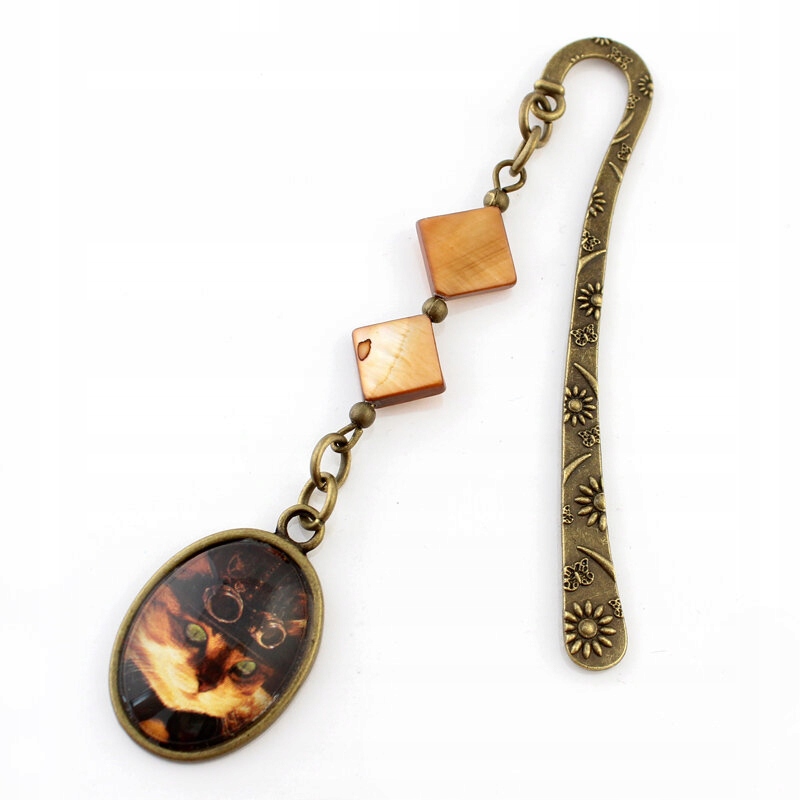 Маленькая закладка ручной работы с подвеской с стимпанк-котом и перламутровыми бусинами. Идеальный подарок любителю чтения.