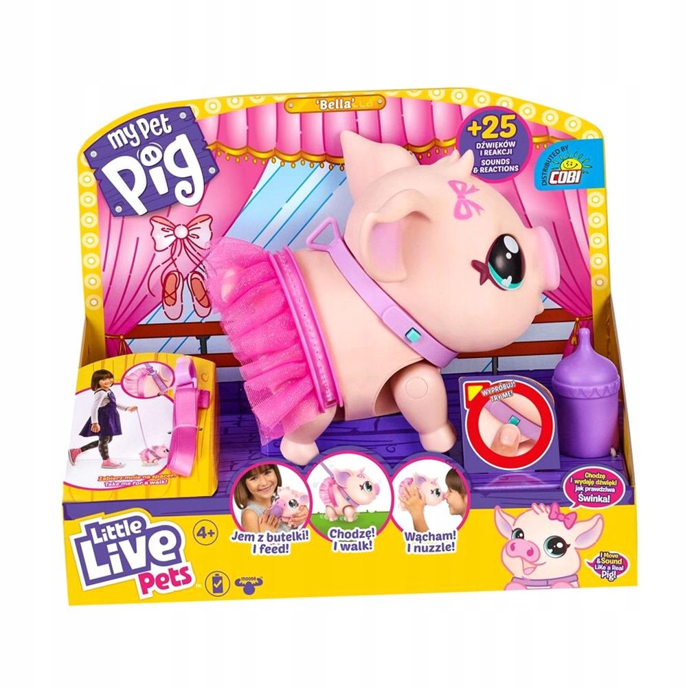 Милая маленькая свинка-балерина в пачке, которая двигается как настоящая свинья. Она издает много забавных и приятных звуков: мурлычет, хихикает, рыгает, фыркает, чихает и даже пукает! Выгуливайте ее на специальном поводке или наблюдайте, как она двигается и танцует под свою музыку. Он реагирует на прикосновения и обожает обнимашки! Еще больше очарования добавляет съемная тюлевая юбка-пачка — незаменимый элемент наряда каждой балерины. А после целого дня игры покормите ее из бутылочки, чтобы придать сил для новой порции веселья.