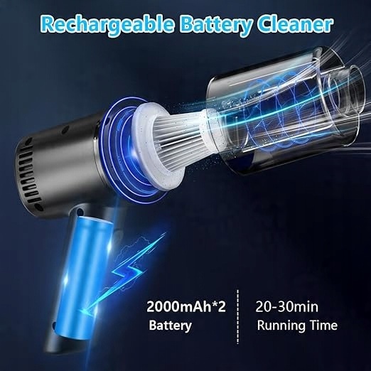 Беспроводной автомобильный пылесос оснащен встроенным аккумулятором емкостью 2000 мАч*2, который можно полностью зарядить за 3–4 часа и непрерывно работать в течение 20–30 минут. Этот беспроводной автомобильный пылесос весит всего 390 г. Он достаточно мал и компактен, чтобы его можно было носить с собой при необходимости, что делает его более удобным в использовании.