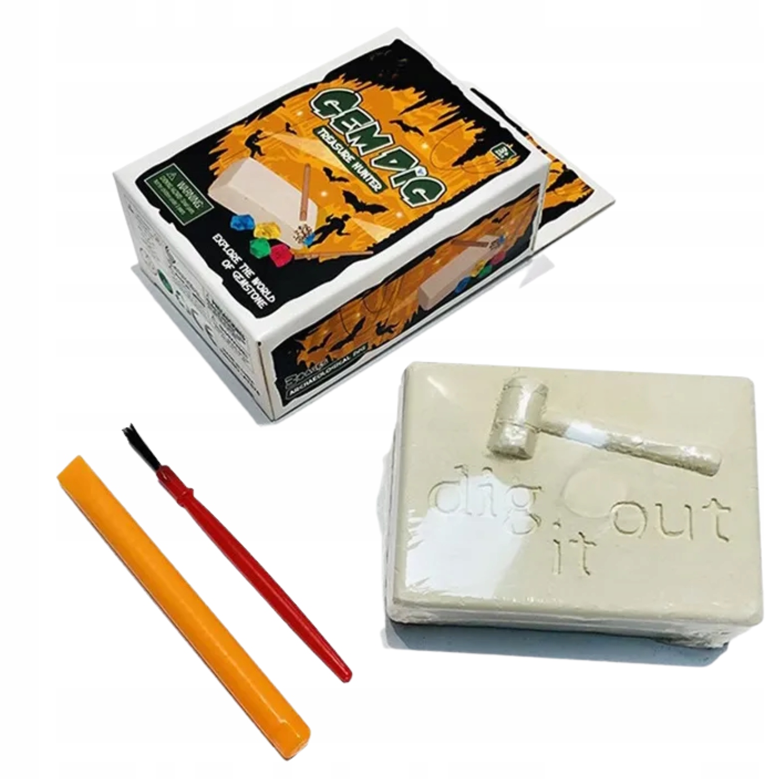 Набор состоит из гипсового блока с заключенными в него драгоценными камнями, инструментов для копания и пошагового руководства, которое проведет вашего ребенка через процесс раскопок.
