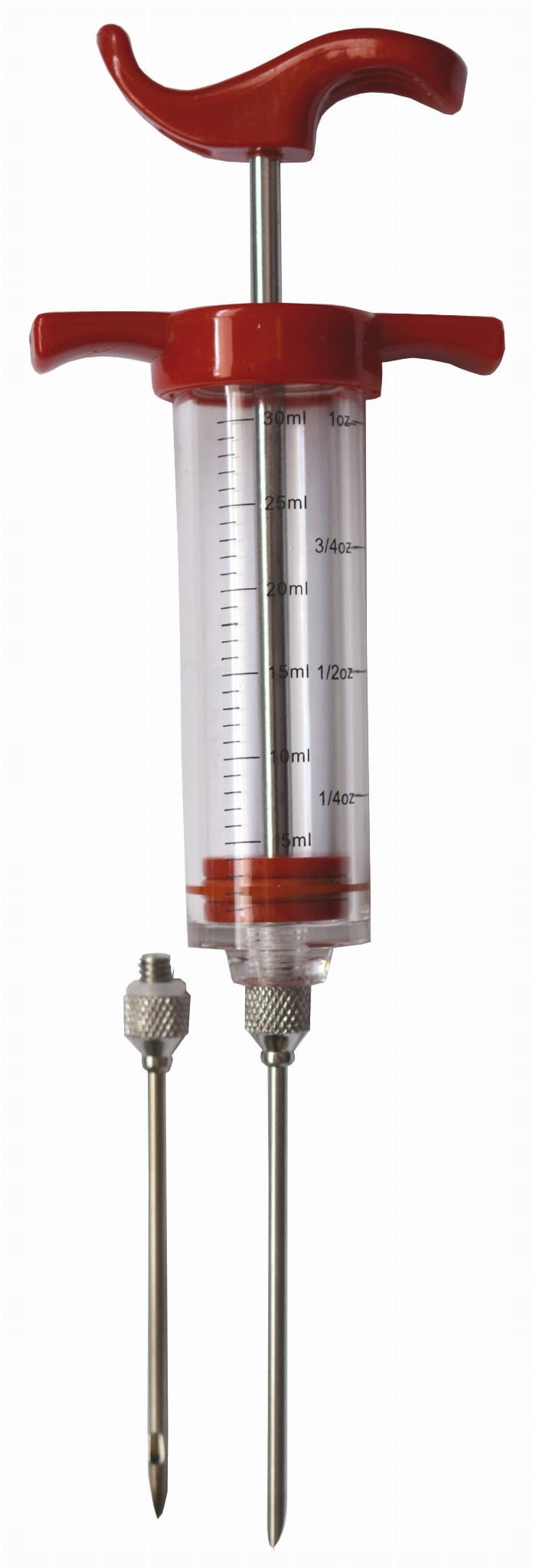 Очень удобный небольшой инжектор для мяса. В комплект входят: многоразовый шприц из пластика с градуировкой через каждые 2 мл, общей емкостью 30 мл и 2 иглы из нержавеющей стали. Одна игла традиционная, другая игла закрыта боковым отверстием. Иглы присоединяются к шприцу с помощью нити. (Иглы ввинчены, поэтому не соскальзывают, когда вы вытаскиваете иглу из мяса)