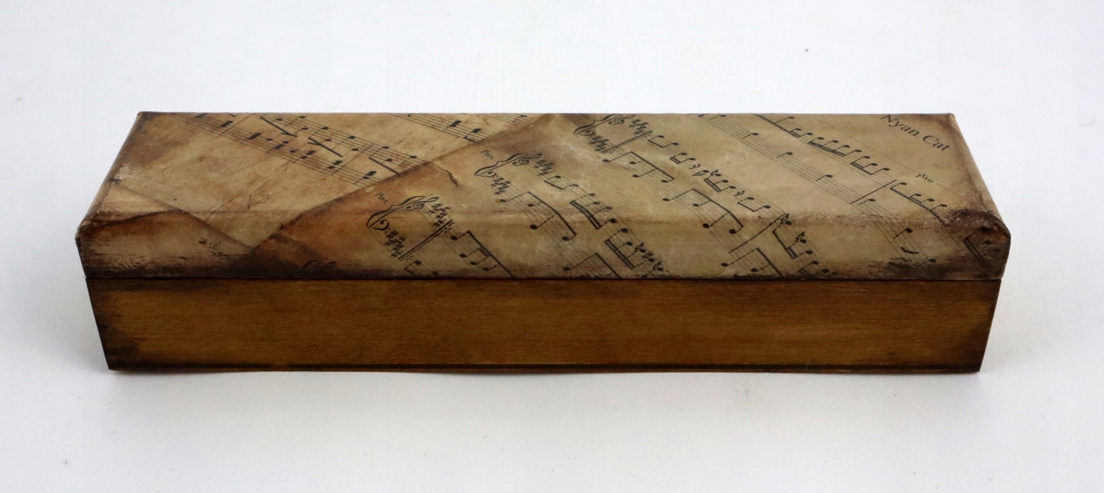 - Шкатулка украшена уникальным музыкальным мотивом с изображением разрозненных нот, пожелтевших от времени.