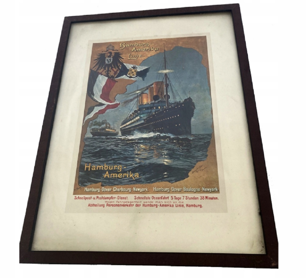 РИСУНОК КАРТИНЫ В ДЕРЕВЯННОЙ РАМКЕ ГРАВИРОВКА РЕКЛАМА ГАМБУРГ АМЕРИКА ЛИНИИ