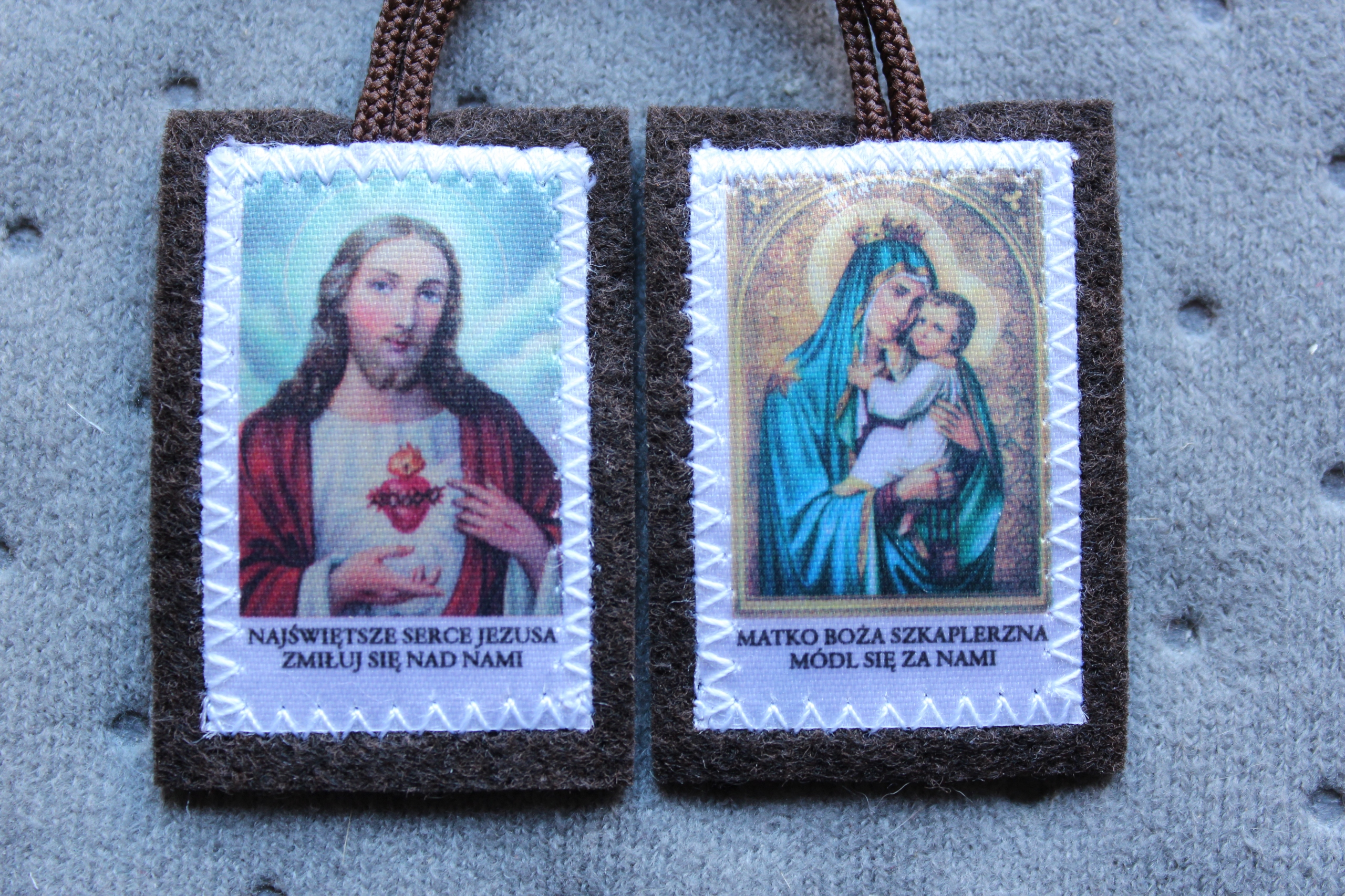 - На коричневом платье изображена лопаточная Богоматерь с надписью «Шкапулярная Богоматерь, молись о нас». а на другом куске ткани вышито изображение Сердца Господа Иисуса с надписью «Пресвятейшее Сердце Иисуса, помилуй нас»