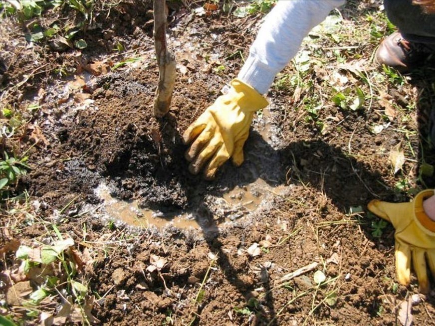 2. В выкопанную ямку выливаем ведро воды (около 10 литров) - если растение меньше, воды явно льем меньше.