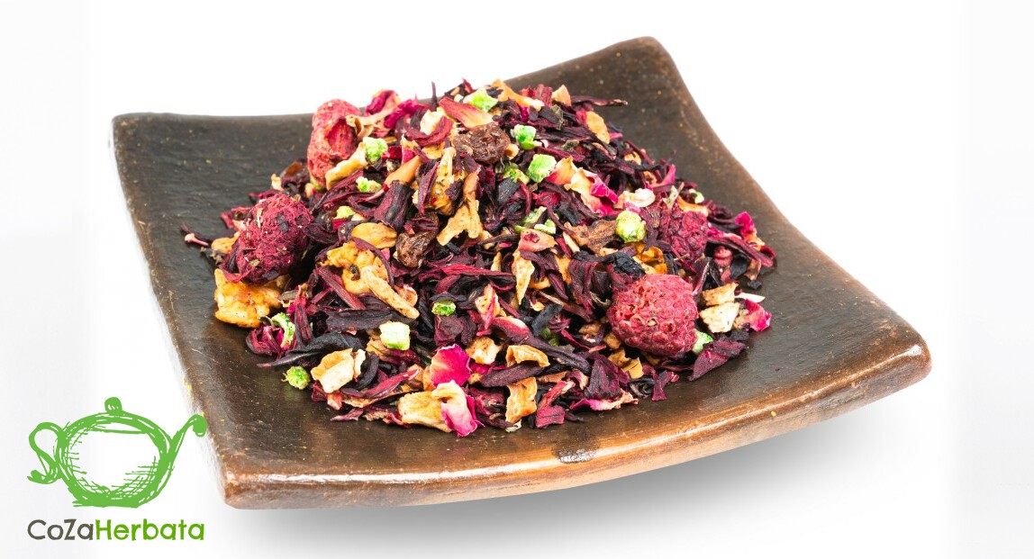 Гибискус, яблоко, лимонная конфета, изюм, свекла, малина сублимированная, мята перечная, морковь сублимированная, лепестки роз, ароматизатор