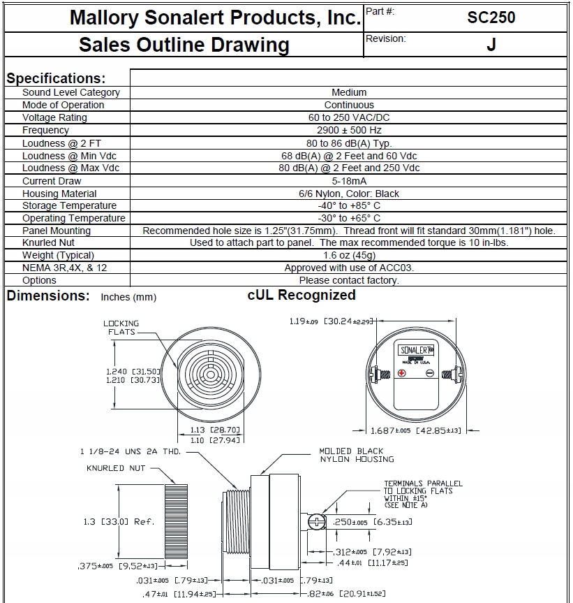 MALLORY SONALERT SC250 60...250 В змінного струму/постійного струму ЗУМЕР СИРЕНА ТРИВОГИ макс.: 86 дБА