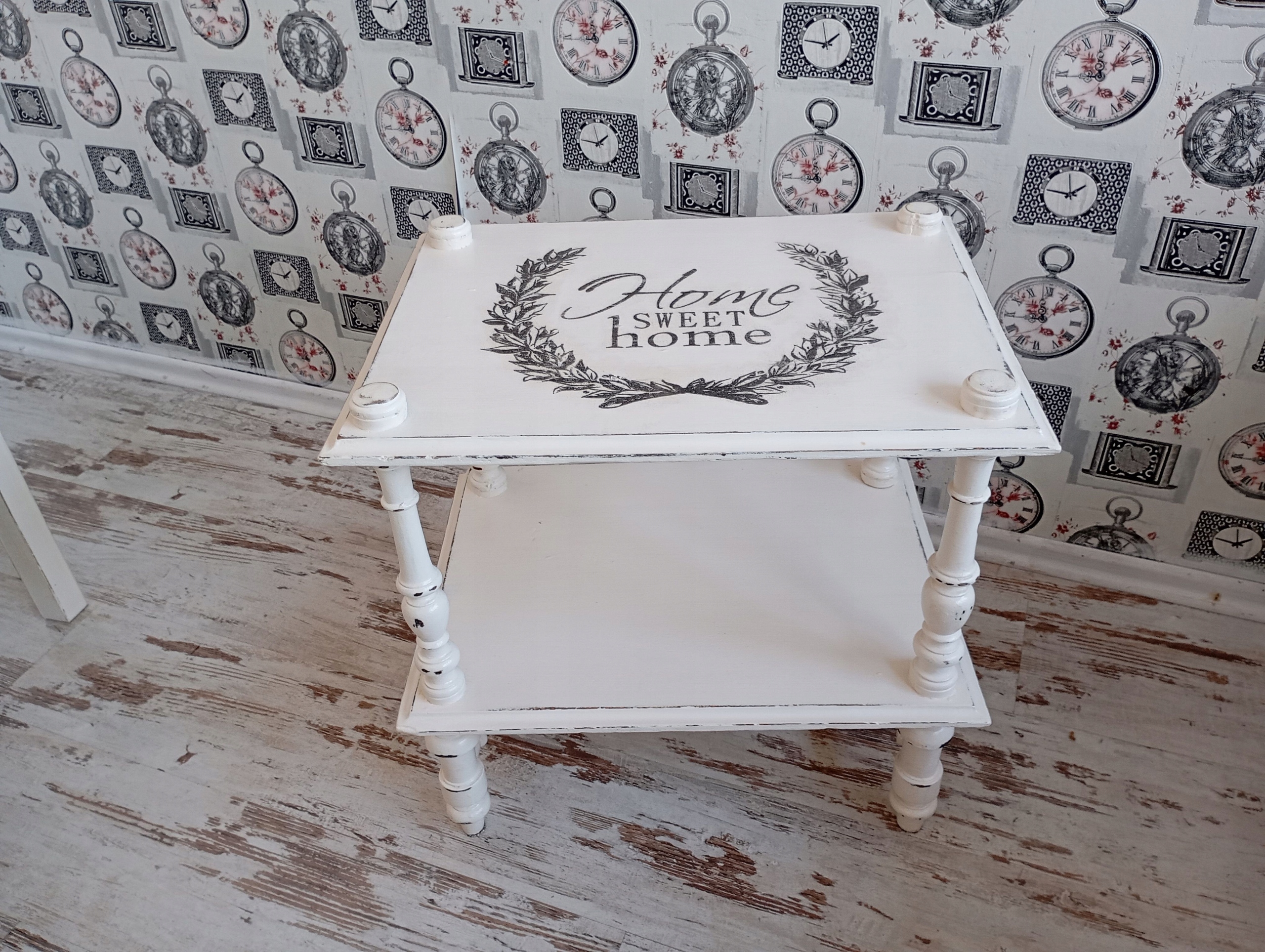 Окрашенный деревянный стол с полкой, потертая шикарная графика