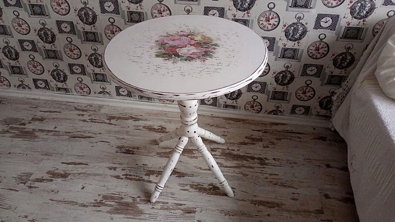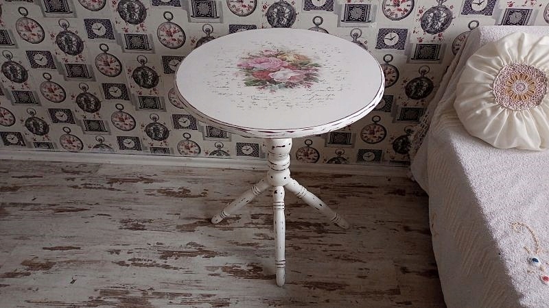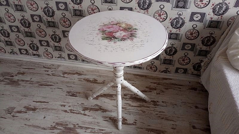 Круглый журнальный столик после ремонта и моделирования, готов к использованию.