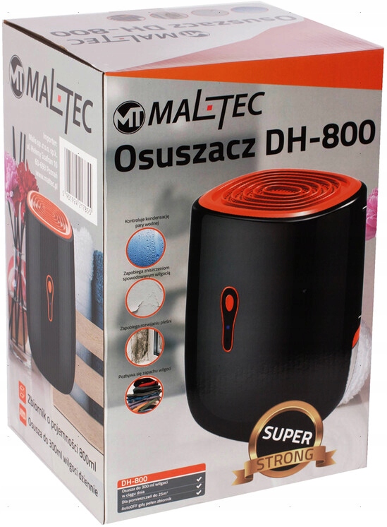 Осушитель воздуха Maltec DH-800 — это компактный осушитель для небольших помещений, таких как спальни, гардеробные, ванные комнаты или шкафчики. Его цвета привлекательны, а добавление оранжевого цвета добавляет ему стиля. Его небольшой размер и вес всего 1 кг. они облегчают беспроблемную транспортировку и использование даже в небольших помещениях. Этот осушитель воздуха Пельтье потребляет очень мало электроэнергии и благодаря своему принципу работы не требует системы размораживания. Кроме того, устройство работает очень тихо, не нарушая сон. Модель DH-800 предоставляет два варианта слива воды: через постоянный водоотвод – с помощью трубы, входящей в комплект, и путем опорожнения бака вручную. Когда бак заполнится, на панели загорится индикатор, и машина прекратит работу, чтобы предотвратить переполнение бака.