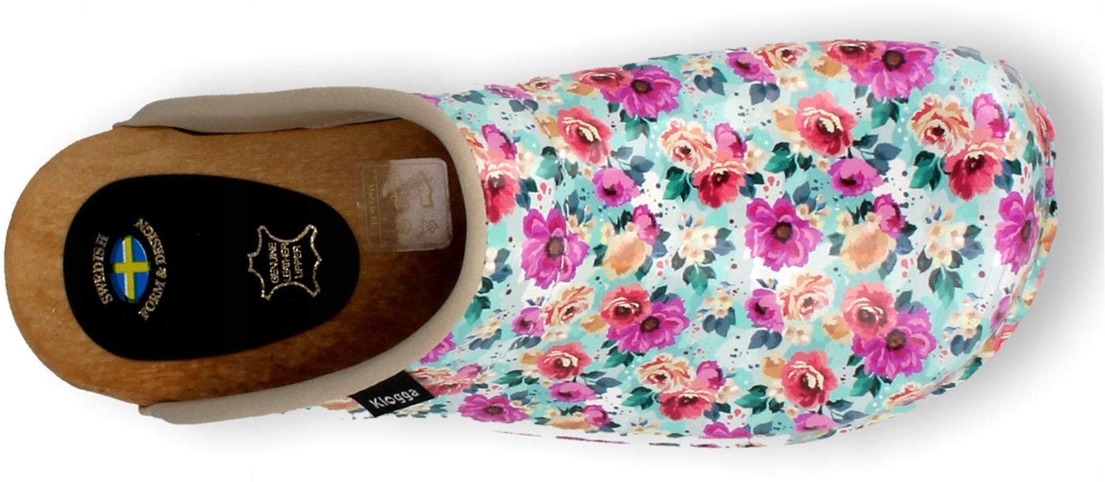 КЛОГГА ТРАВЫ - вызывающие положительные ассоциации, несущие дыхание весны и аромат лета, сабо из натуральной лакированной кожи с гербарным мотивом на светло-коричневой деревянной подошве