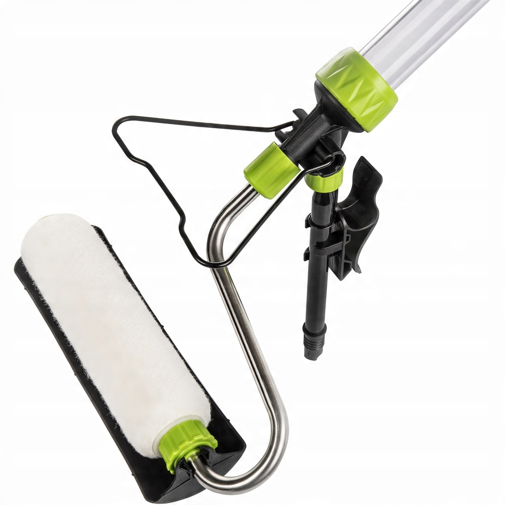 Малярный валик с перфорированной структурой, оснащенный удлинителем стержень и встроенный контейнер емкостью 0,54 л. Оснащен крышкой, защищающей от капель. Поддерживающее основание в случае избытка краски. Изготовлен из прочного пластика и металла. В комплект поставки также входит вазелин для обеспечения плавного вращения валика.