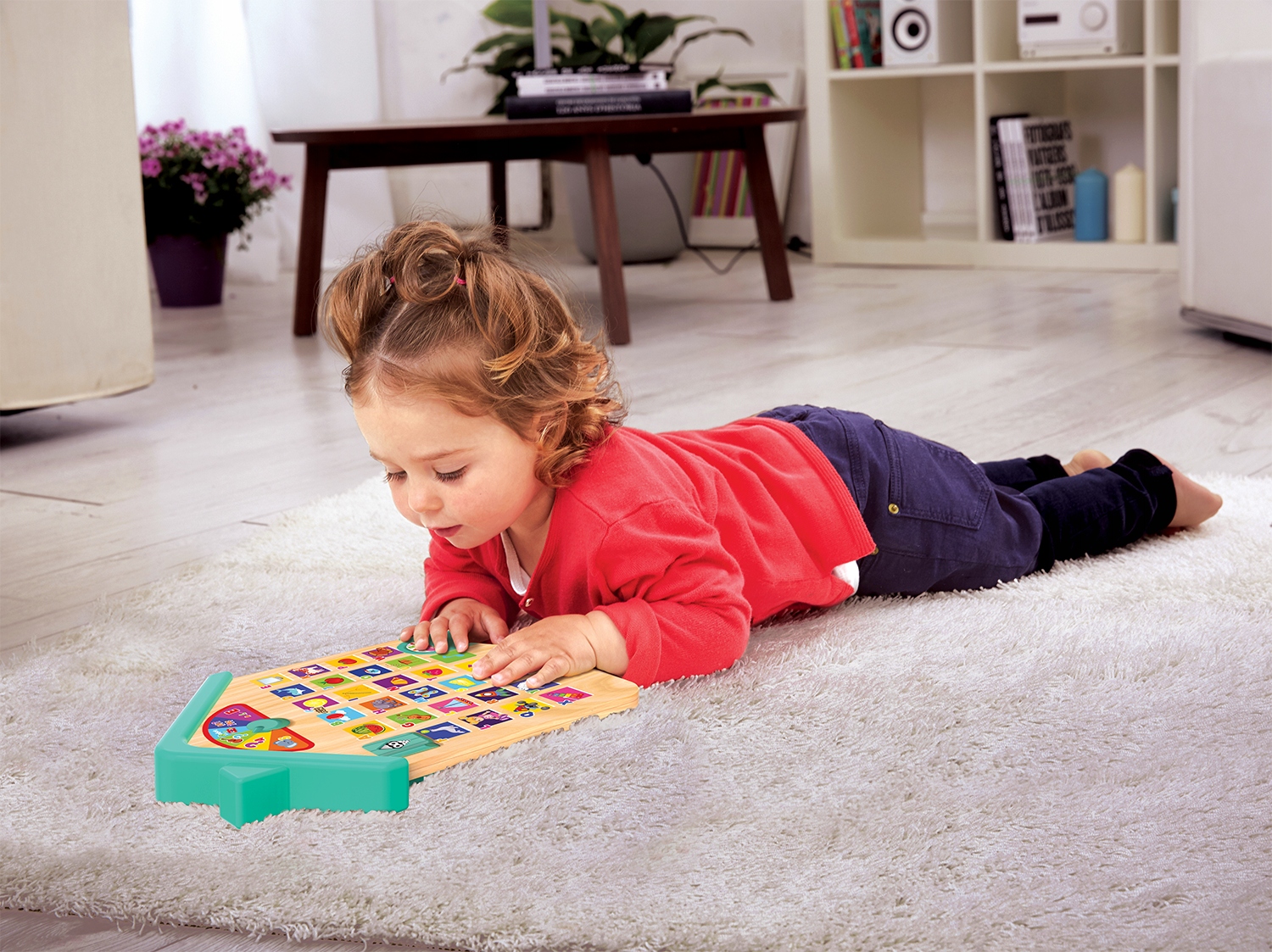 Игрушка оснащена целых 6 различные режимы, с помощью которых ребенок будет открывать буквы, изучать их произношение, положение в алфавите и изучать примеры их использования. Каждой букве соответствует картинка разного цвета, что позволяет легче связать букву со словом, которое с нее начинается. Функция повтора снова проиграет последний звук, а кнопка «Нота» проиграет веселые мелодии. В открывающейся дверце скрыта кнопка, активирующая песенку-азбуку.