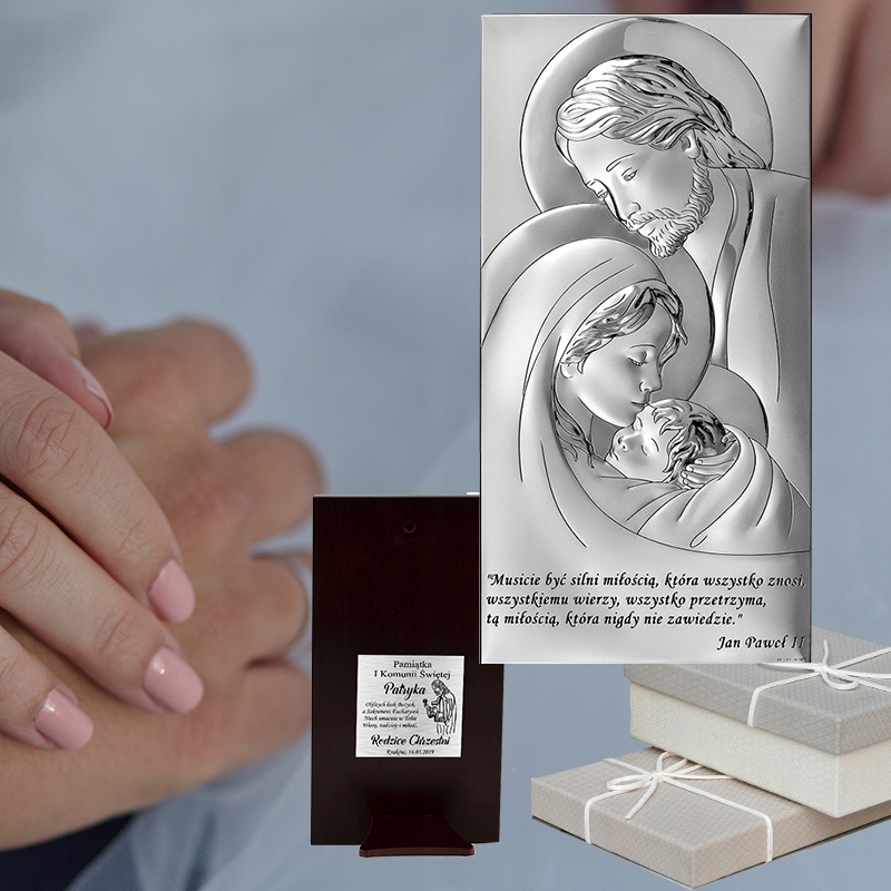 Серебряная картина Стирна Священное Семейство - Богоматерь с Йозефом и ребенком. Этот символ напоминает, насколько важна семья, особенно самые близкие и культивирующие связи между его отдельными членами. Помогает в трудные периоды и играет большую роль в семейных отношениях.